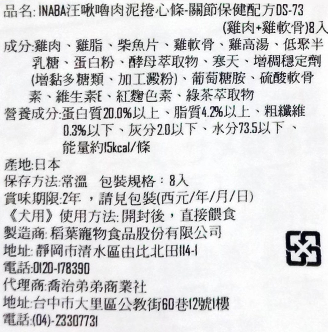 INABA 汪啾嚕肉泥捲心條關節保健配方,是專為愛犬設計的美味又健康的零食。這款肉泥捲心條結合了鮮嫩的雞肉和富含膠原蛋白的雞軟骨,不僅口感豐富,還能幫助維護狗狗的關節健康。每包含有8條獨立包裝的肉泥捲心條,方便餵食和保存。添加綠茶消臭成分,有助於減少狗狗便便的異味。讓您的愛犬在享受美味的同時,也能獲得關節保健的益處。