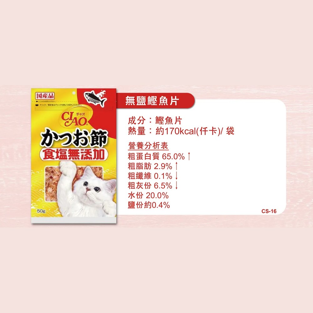 INABA 無鹽柴魚片,是專為愛貓設計的美味零食。這款50g的柴魚片,不含食鹽,讓您可以安心餵食,不必擔心造成貓咪腎臟負擔。適合全齡貓咪。柴魚片的鮮美滋味,能有效提升貓咪的食慾,讓牠們享受美味的同時,也能補充營養。獨立包裝,方便餵食與保存,隨時給您的愛貓帶來一份美味的驚喜。