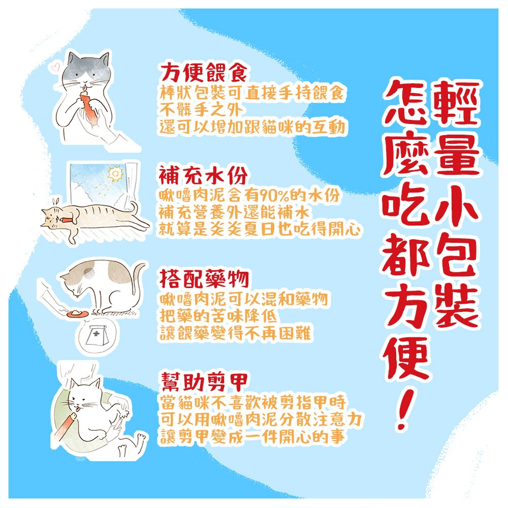 - 柔軟肉泥質地,方便貓咪舔食,輕鬆享受美味,補充所需營養。