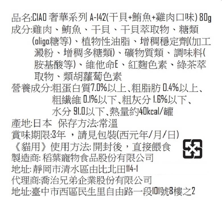 - 採用日本原裝進口配方,確保食品安全與品質,讓您安心餵食您的愛貓。