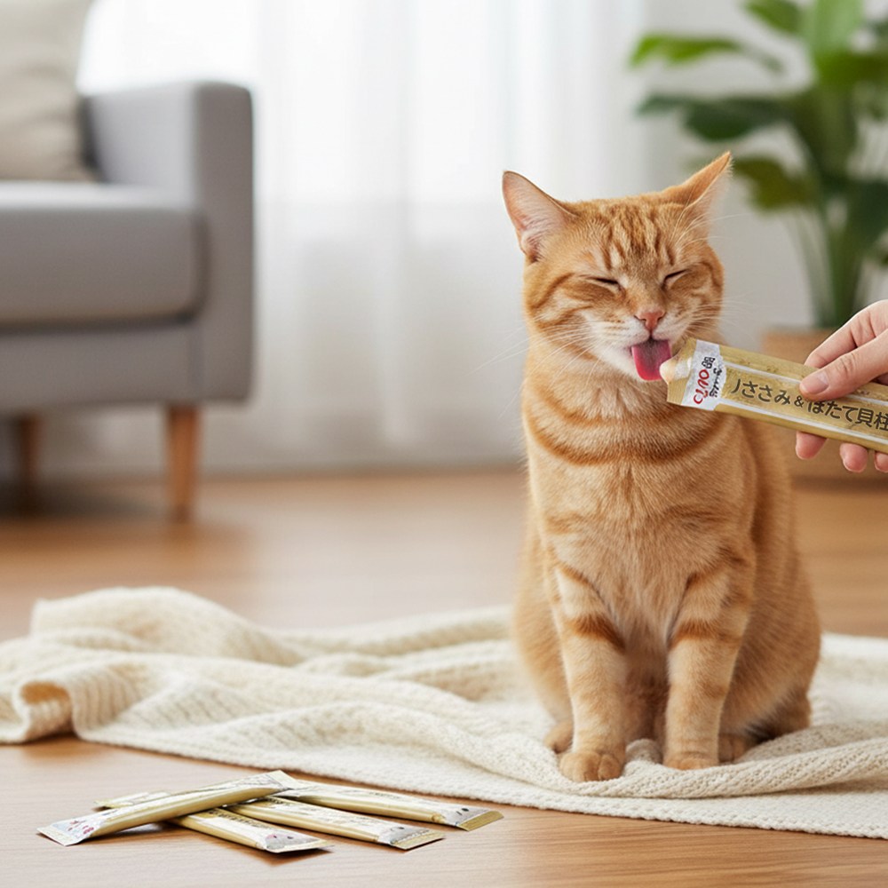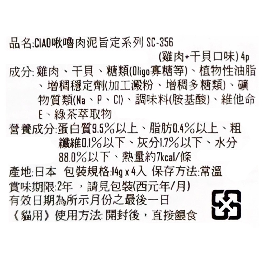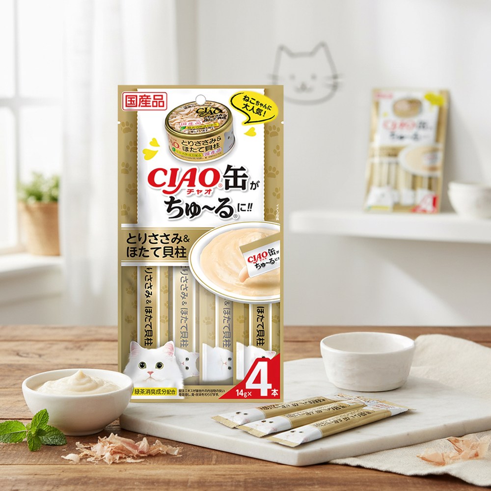 INABA CIAO 啾嚕 旨定系列肉泥,為您的愛貓帶來極致的味覺享受!這款雞肉+干貝口味的肉泥,採用日本國產食材,保證新鮮與美味。每包含有四條14g的肉泥,總重56g,方便餵食且易於保存。CIAO 啾嚕肉泥不僅美味,更添加綠茶消臭成分,讓居家環境更清新。無論是作為日常零食或獎勵,都能讓您的愛貓愛不釋手,享受與您互動的快樂時光。