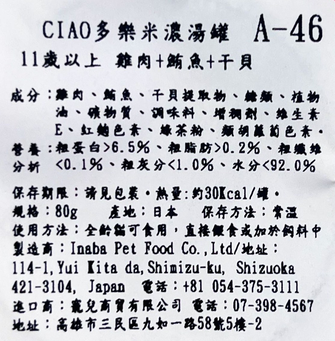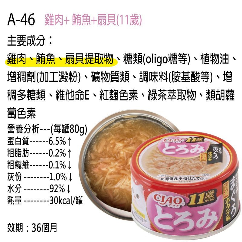 為您的愛貓提供美味又營養的享受!INABA CIAO 啾嚕濃厚系列 11歲 A-46,專為11歲以上的成貓設計,每罐80克的濕糧點心,一箱24罐,讓您的貓咪盡情享受。這款獨特的雞肉+鮪魚+扇貝(干貝)風味,不僅美味可口,還能補充貓咪所需的營養。採用日本國產原料,保證品質與安全,讓您安心餵食。濃郁的口感和香氣,能刺激貓咪的食慾,讓牠們愛不釋手。無論是直接餵食,還是拌在主食中,都能為貓咪帶來豐富的味覺體驗。
