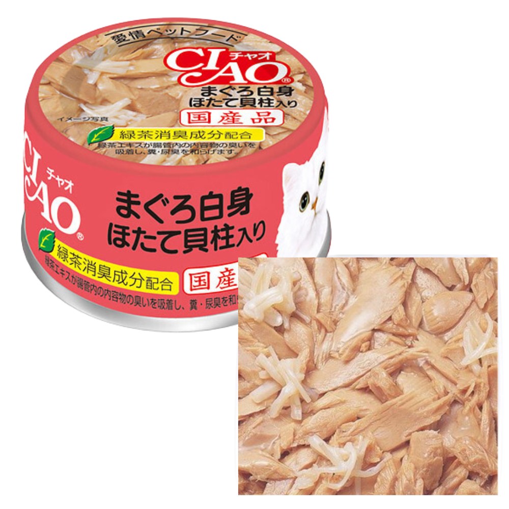 - 嚴選白身鮪魚搭配鮮甜干貝,提供豐富蛋白質與Omega-3脂肪酸,呵護貓咪的健康。
