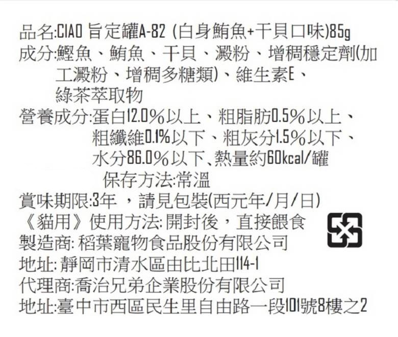 INABA CIAO 啾嚕旨定罐,為您的愛貓帶來極致的味蕾享受。這款A-82白身鮪魚+干貝口味,每罐85g,一箱24罐裝,總重2040g,是成貓的理想選擇。嚴選高品質白身鮪魚與鮮甜干貝,提供豐富的蛋白質與營養,同時滿足貓咪的口腹之慾。添加綠茶消臭成分,保持居家環境清新。CIAO啾嚕旨定罐不僅美味,更關心貓咪的健康,讓您安心餵食。