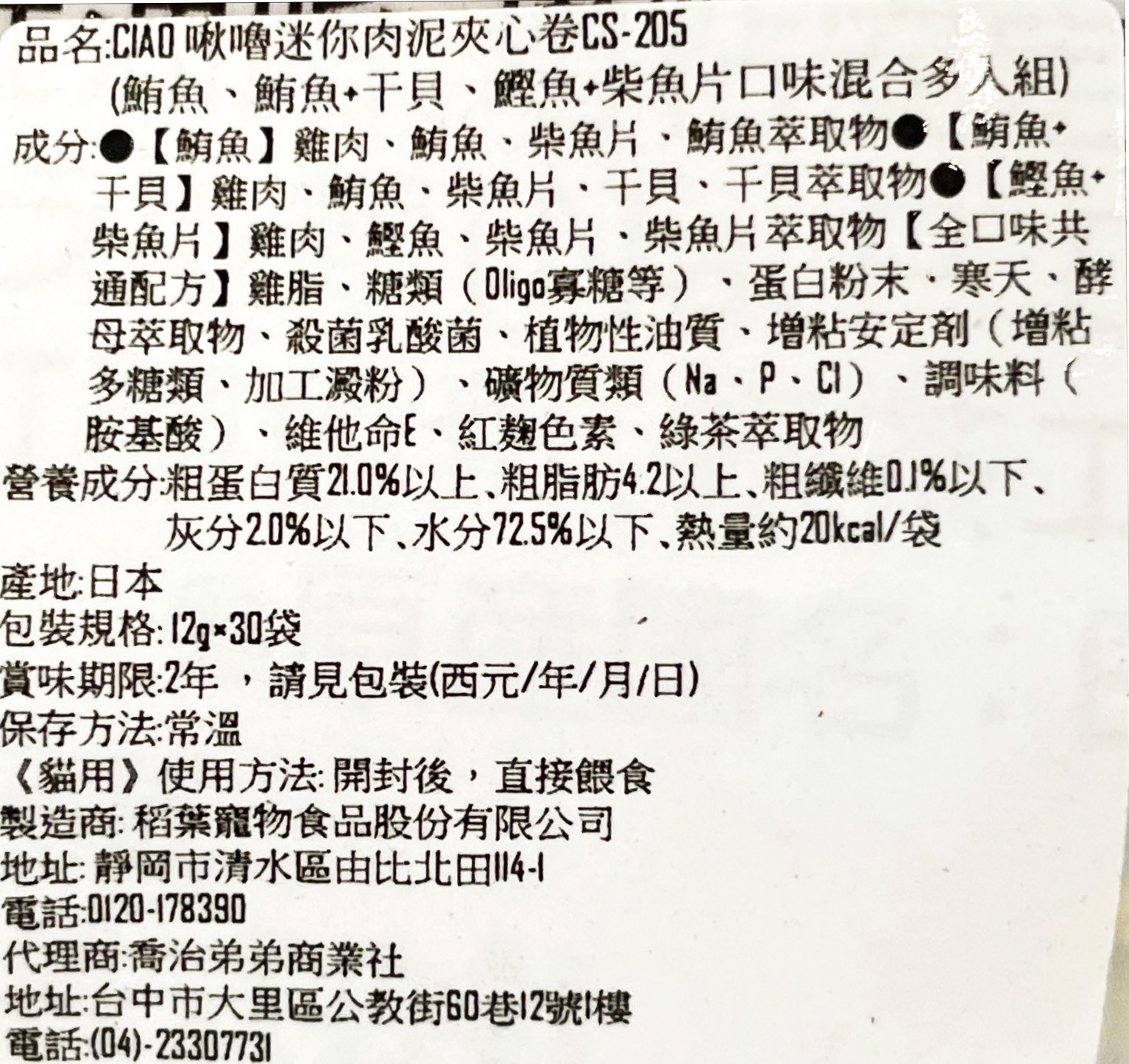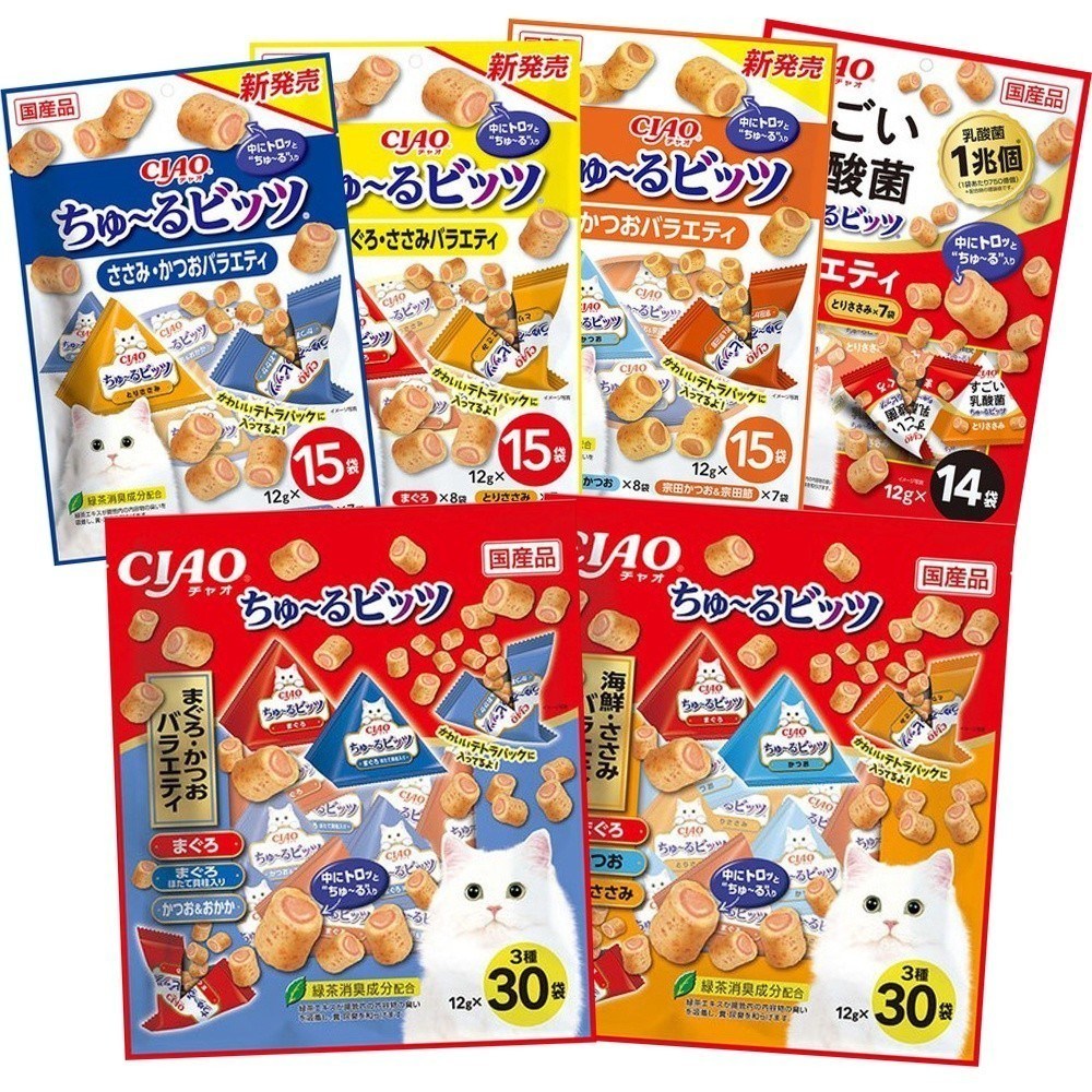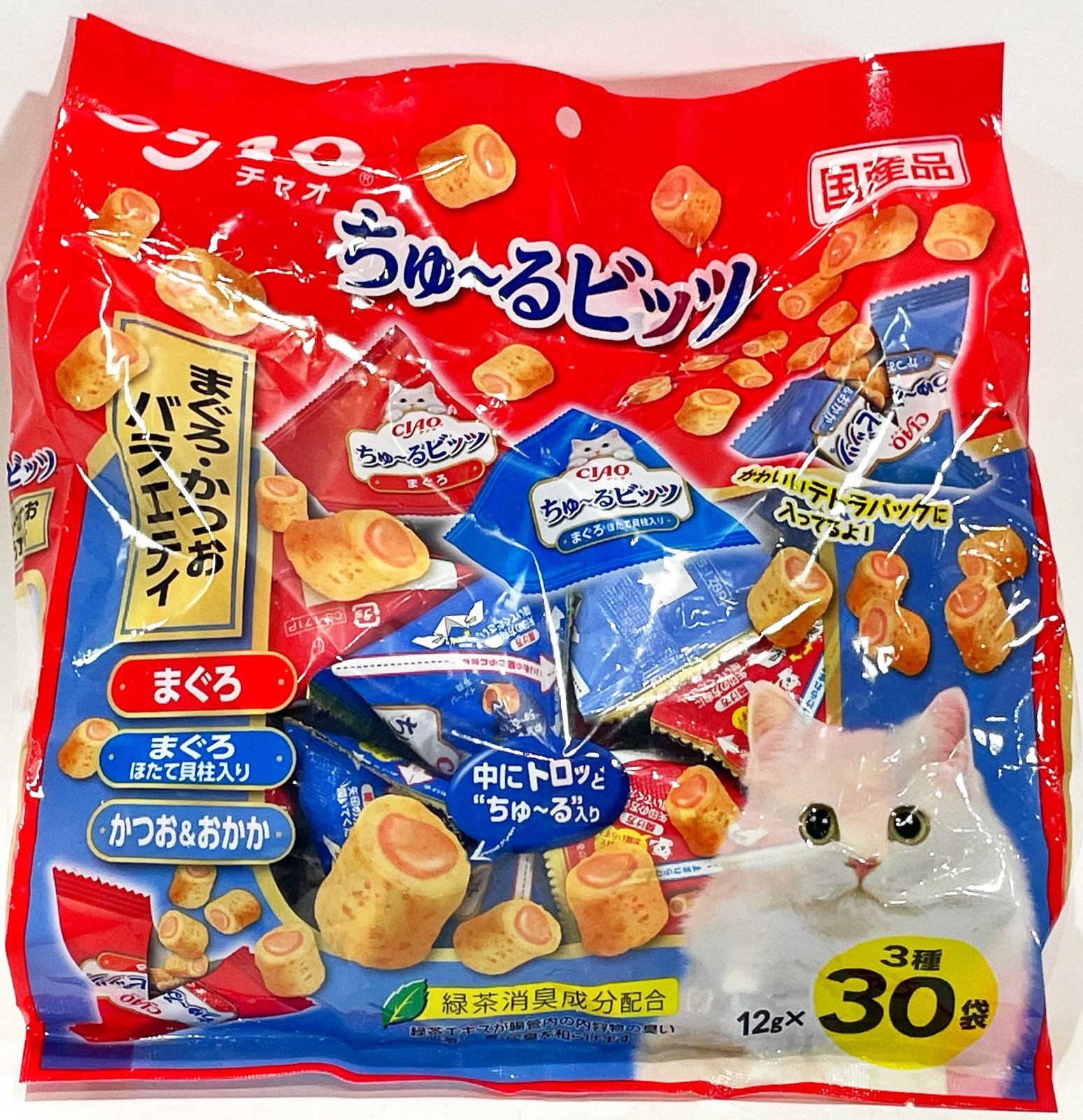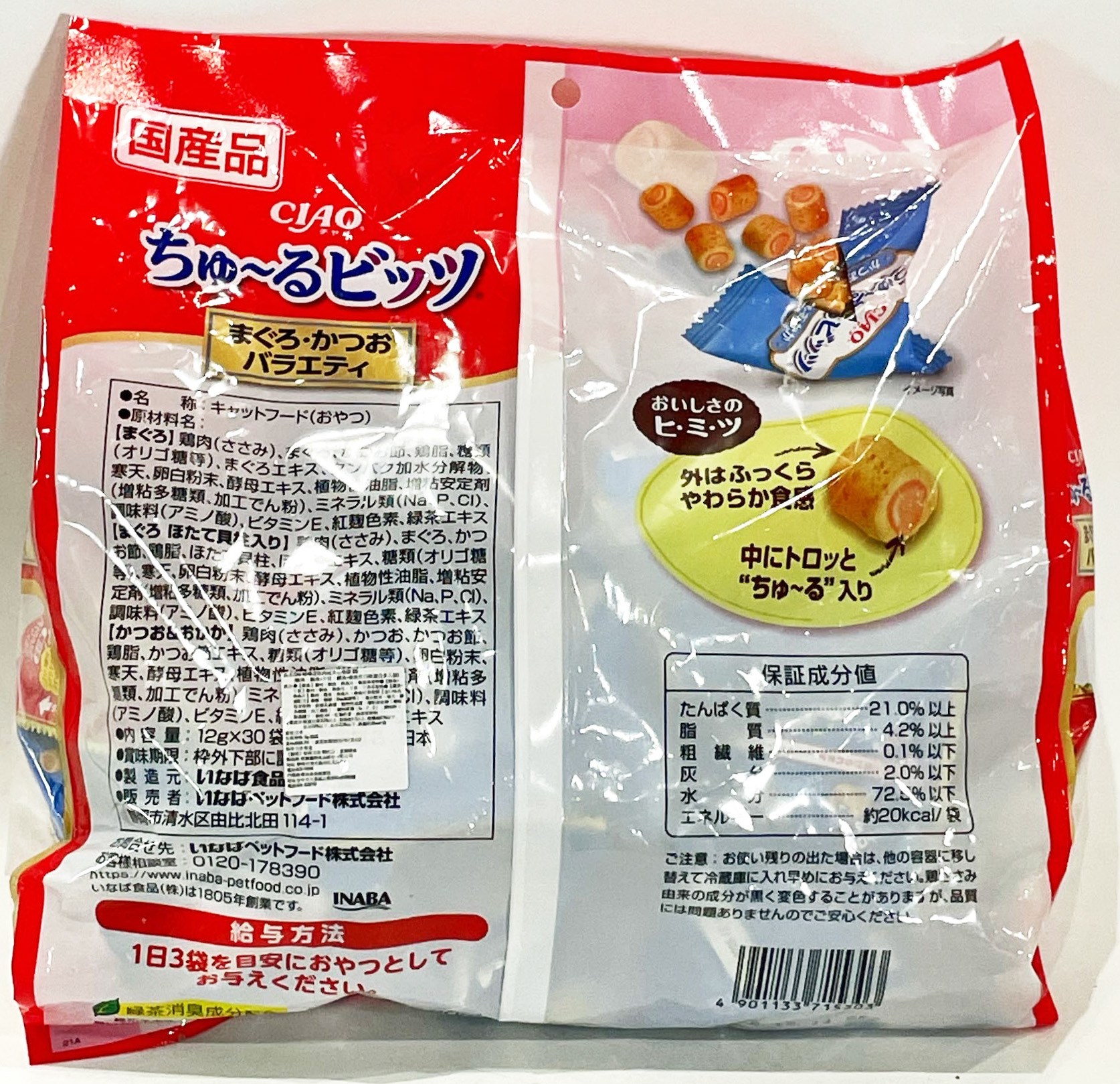 INABA CIAO 啾嚕迷你肉泥夾心卷,為您的愛貓帶來多重美味享受!這款零食包含鮪魚、鮪魚+干貝、鰹魚+柴魚片三種口味,每袋30包,每包12克,總重360克。肉泥夾心卷外層鬆軟,內餡滑順,口感豐富,讓貓咪愛不釋手。產品採用優質食材,保證貓咪的健康與活力。獨立小包裝方便餵食,保持新鮮,是您寵愛貓咪的最佳選擇。