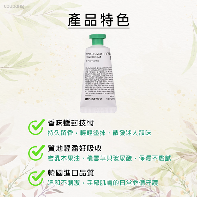 INNISFREE 我的香氛護手霜 02 Fluffy Pink,為您帶來如棉花糖般的柔軟呵護。這款30ml的護手霜,蘊含豐富的保濕成分,能有效滋潤乾燥的雙手,讓肌膚恢復柔嫩光滑。其獨特的香氛配方,散發出淡淡的粉嫩香氣,讓您在使用時心情愉悅,彷彿置身於浪漫的粉色世界。輕巧的設計,方便您隨身攜帶,隨時隨地呵護您的雙手,這款護手霜也不例外,讓您在享受美麗的同時,也能安心使用。