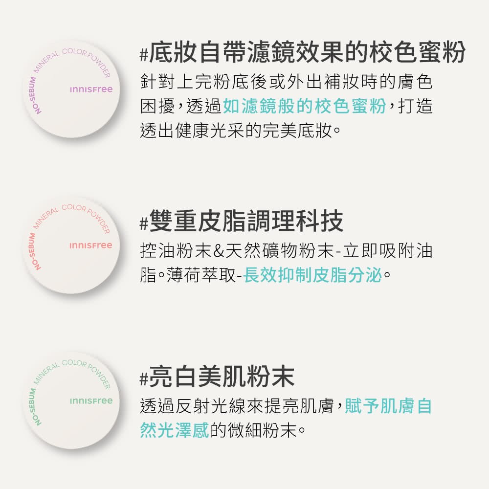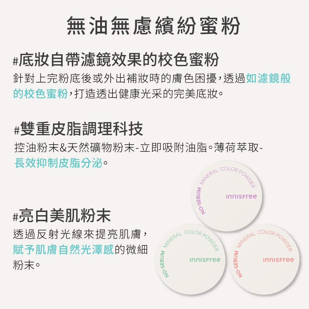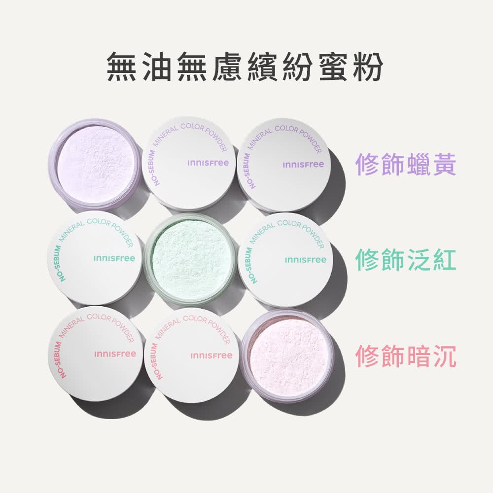 告別油光,展現清新妝容!INNISFREE 無油無慮繽紛蜜粉,輕盈粉末能有效吸附多餘油脂,打造乾爽舒適的肌膚觸感。紫色調蜜粉能自然提亮膚色,修飾蠟黃暗沉,讓妝容更顯明亮動人,溫和不刺激,敏感肌也能安心使用。5g輕巧包裝,方便隨身攜帶,隨時隨地維持完美妝容。無論是定妝、補妝,或是單獨使用,都能讓您擁有無瑕美肌。