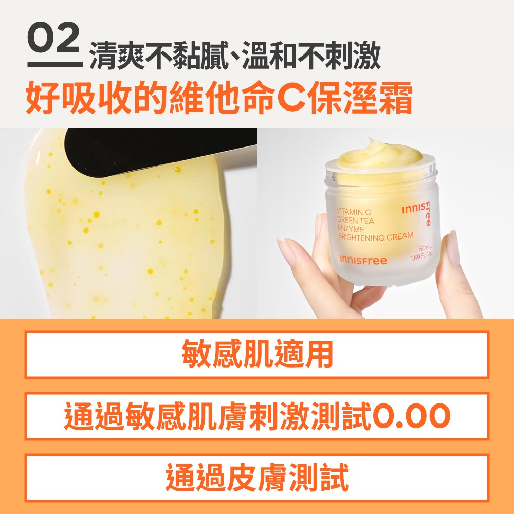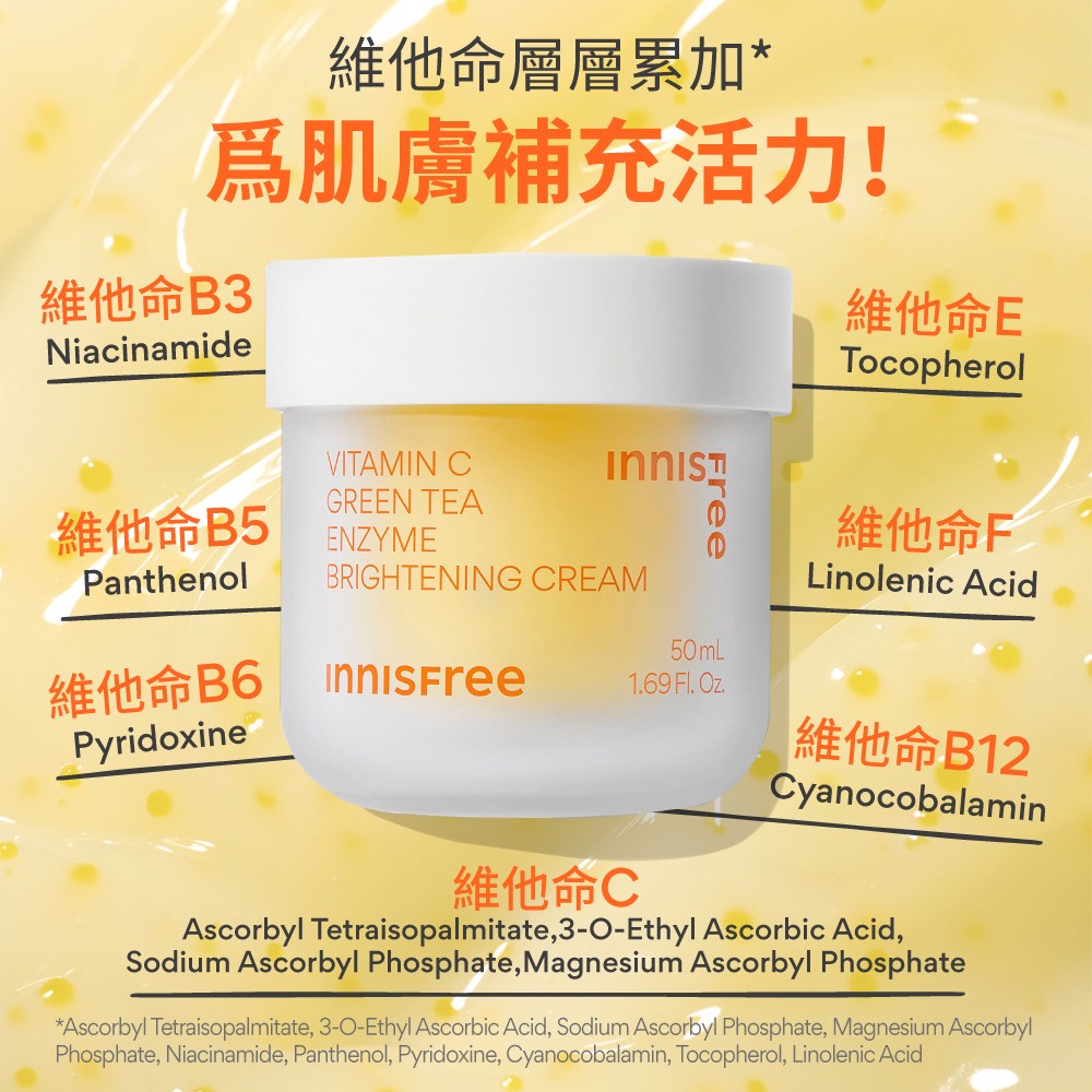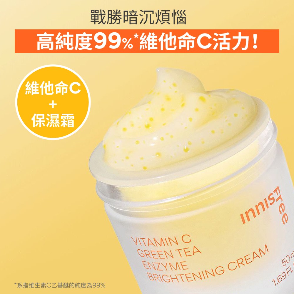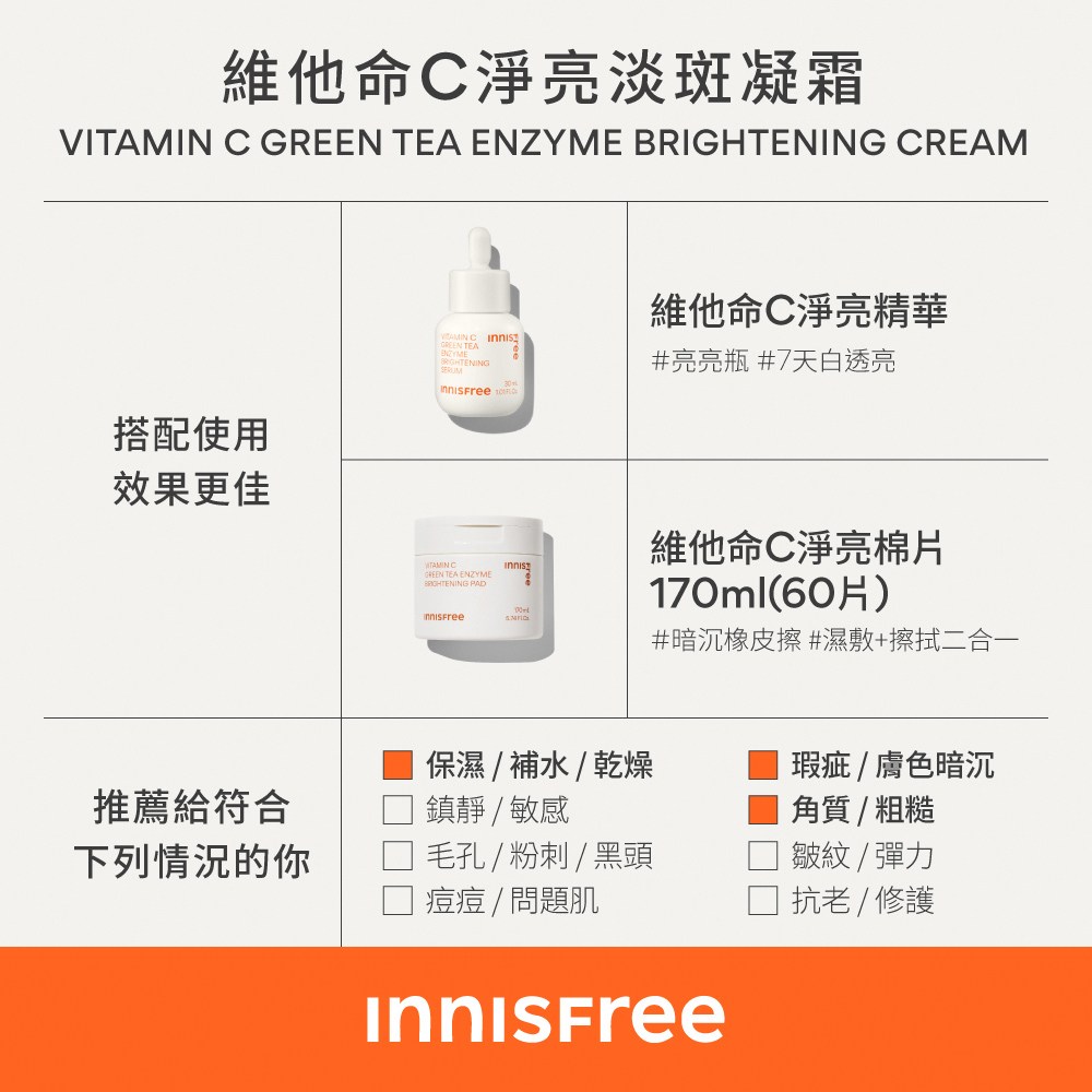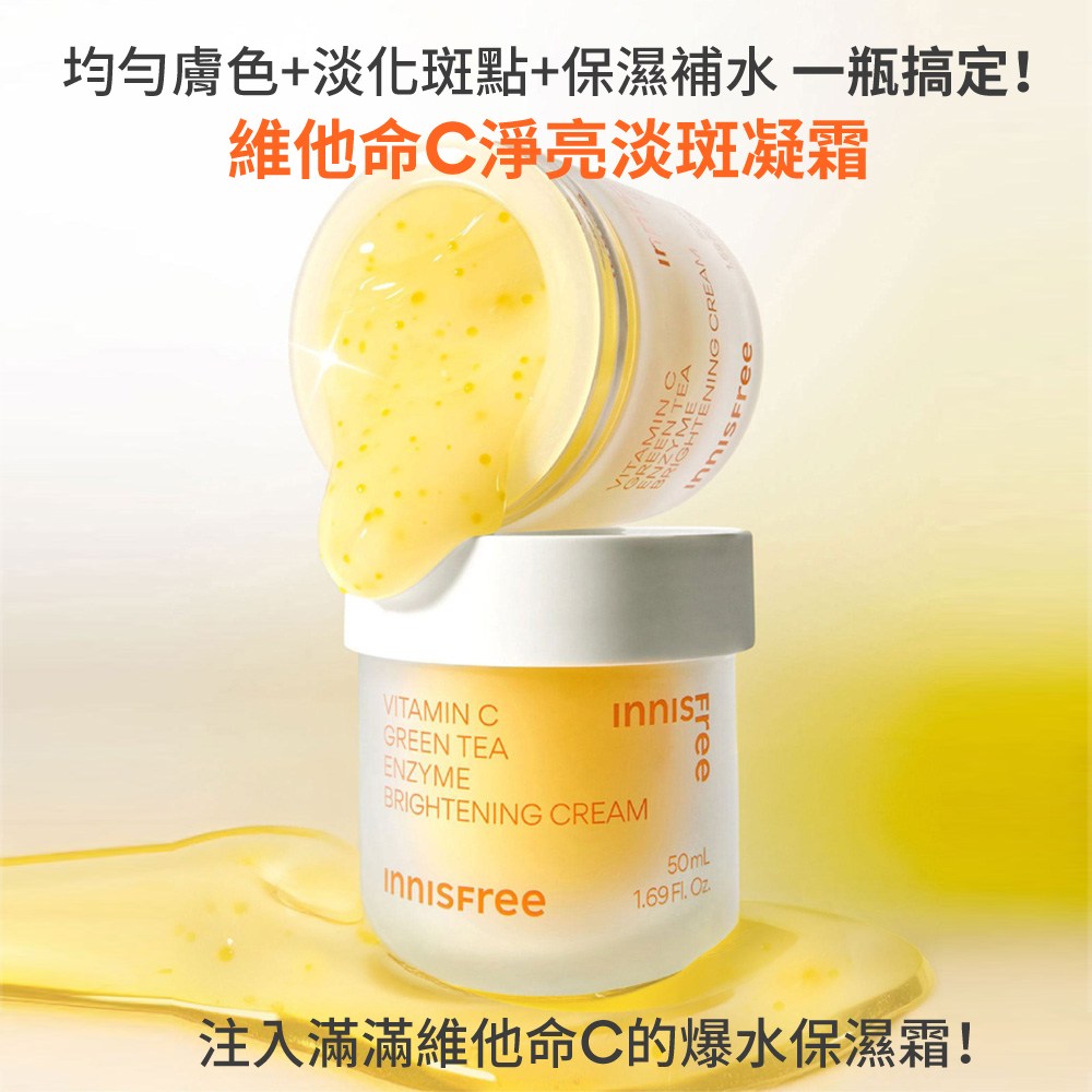 INNISFREE 維他命C淨亮淡斑凝霜,富含高純度維他命C,能有效改善肌膚暗沉,淡化斑點,使肌膚更加明亮透澈。凝霜質地輕盈水潤,添加綠茶酵素,能溫和代謝老廢角質,改善粗糙,讓肌膚恢復細緻平滑。同時,它還能為肌膚補充水分,長效保濕,告別乾燥困擾。使用後,肌膚煥發健康光澤,展現自信美麗。