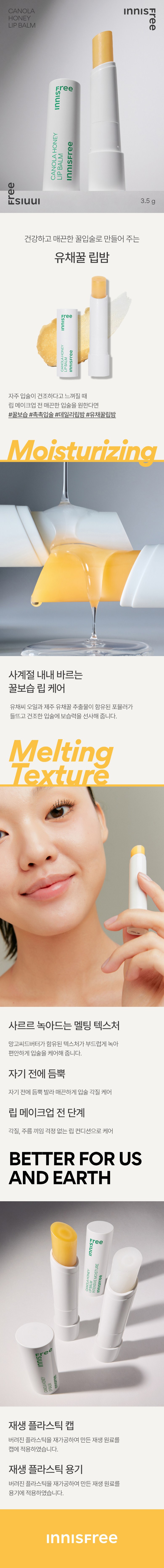 INNISFREE 芥花糖蜜水感護唇膏,蘊含濟州油菜籽油和蜂蜜萃取物,能為乾燥的雙唇提供深層保濕。其輕柔融化的質地,能舒適地呵護雙唇,改善唇部乾燥脫皮現象。一年四季皆可使用,妝前使用可使唇妝更服貼,睡前厚敷則可加強修護。採用再生塑膠瓶蓋,為地球永續盡一份心力,讓您在保養雙唇的同時,也能愛護環境。