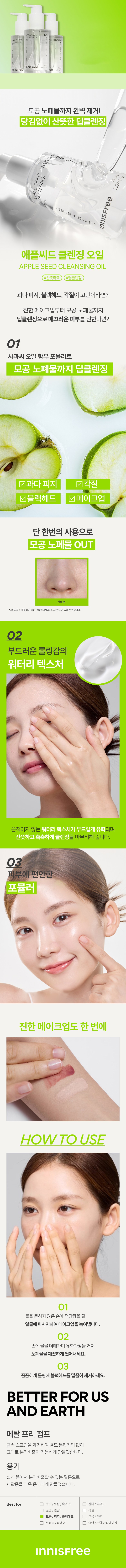innisfree 蘋果籽深層卸妝油,蘊含蘋果籽油配方,能深入清潔毛孔內的彩妝殘留與髒汙,讓肌膚恢復潔淨。其水感質地,在按摩時能溫和乳化彩妝,卸妝過程舒適不刺激。使用後,肌膚感到清爽水潤,不緊繃。無金屬壓頭設計,環保愛地球。輕鬆卸除彩妝,同時呵護您的肌膚。