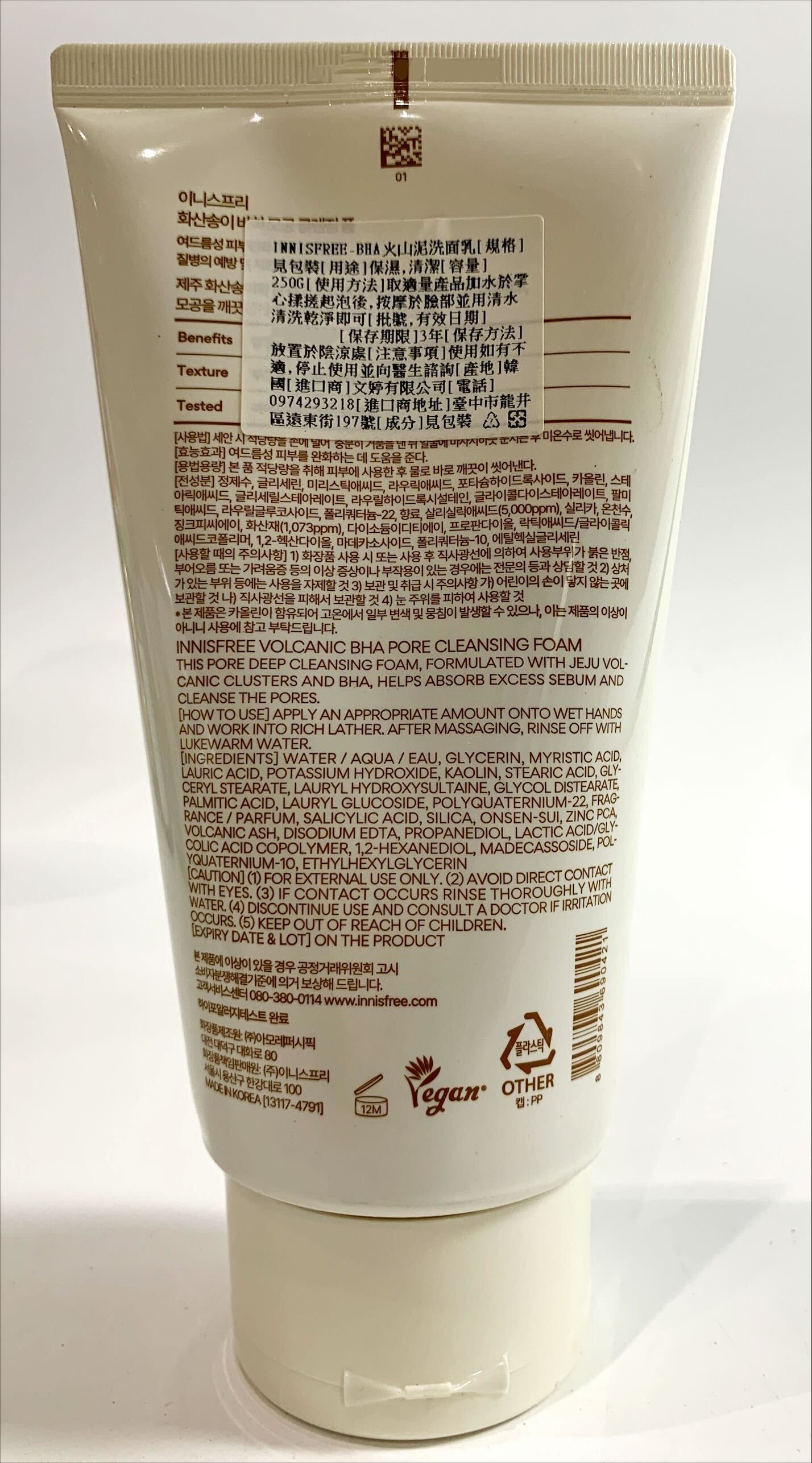 INNISFREE BHA火山泥洗面乳,結合濟州火山泥與BHA成分,深層清潔毛孔,有效吸附多餘皮脂與髒汙,讓肌膚恢復潔淨清爽。綿密細緻的泡沫,溫和洗淨臉部,去除老廢角質,使肌膚觸感更加柔滑。添加濟州溫泉水與羥基積雪草苷,舒緩肌膚不適,敏感肌也能使用。洗後肌膚不緊繃,展現健康光澤,是日常清潔的理想選擇。大容量包裝,CP值更高。