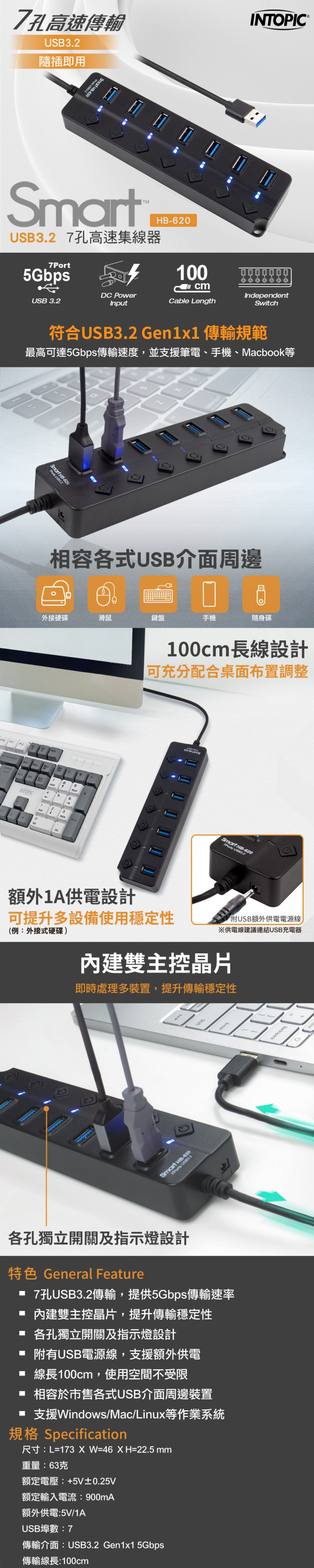 INTOPIC 廣鼎 USB3.2 7孔高速集線器 HB-620 100cm長線設計 獨立開關及指示燈, 1個