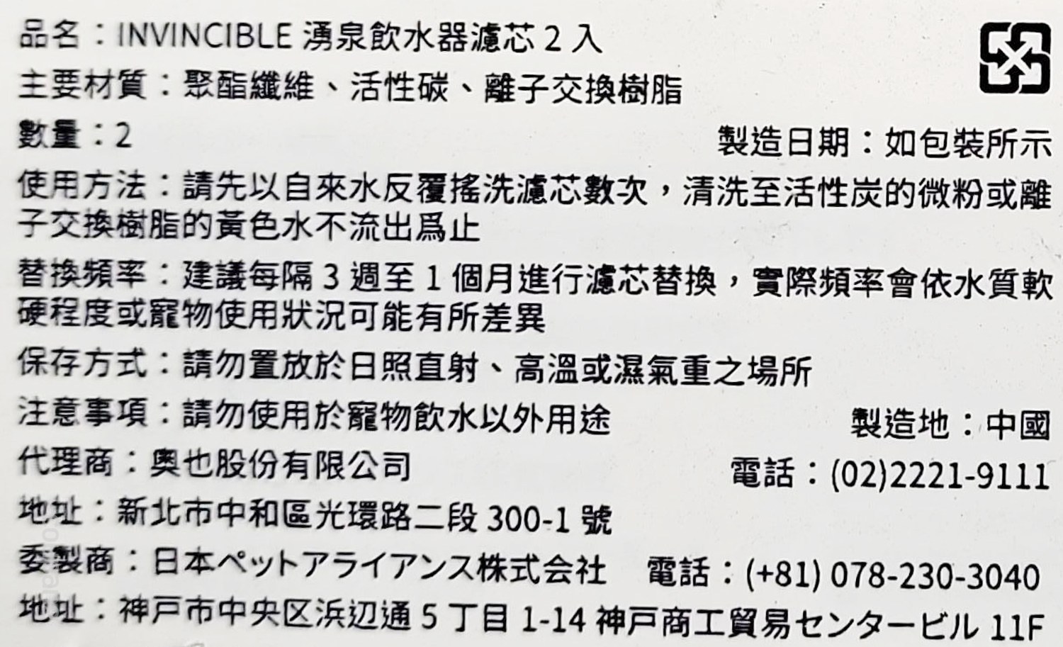 INVINCIBLE 湧泉飲水器濾芯,為您的寵物提供潔淨健康的飲用水。此濾芯採用活性碳材質,有效過濾水中雜質、異味及有害物質,確保寵物飲水安全。建議每3週至1個月更換濾芯,以維持最佳過濾效果。每包內含2入濾芯,方便您定期更換,讓您的愛寵隨時享受純淨好水。選擇 INVINCIBLE 濾芯,給您的寵物最好的呵護。