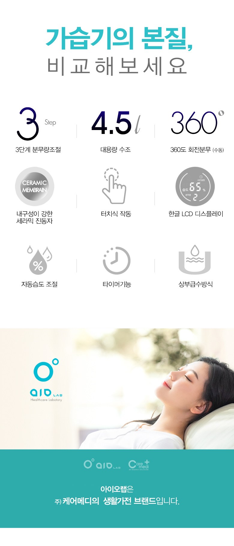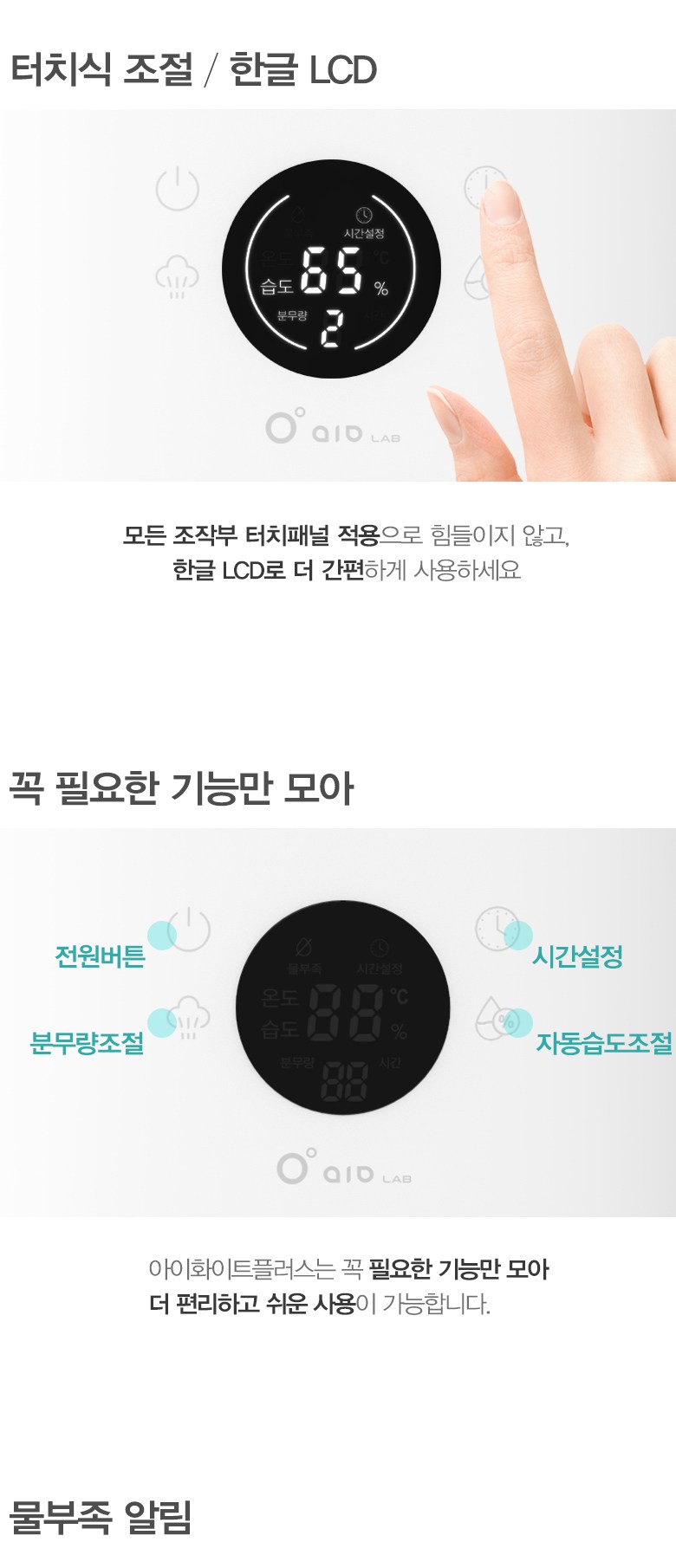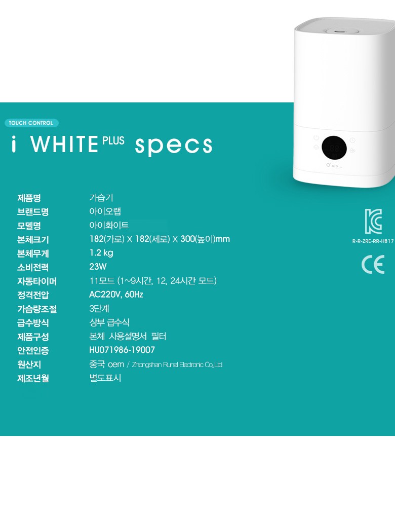aio LAB iWhite Plus 加濕器,以簡約設計與實用功能,提升您的生活品質。4.5公升大容量水箱,減少頻繁加水,搭配360度旋轉噴霧,全方位加濕。觸控式操作與韓文LCD顯示,操作簡單易懂。內建自動濕度調節功能,維持舒適濕度,另有缺水提醒,使用更安心。隨附六入濾網套組,過濾雜質,享受清新空氣。