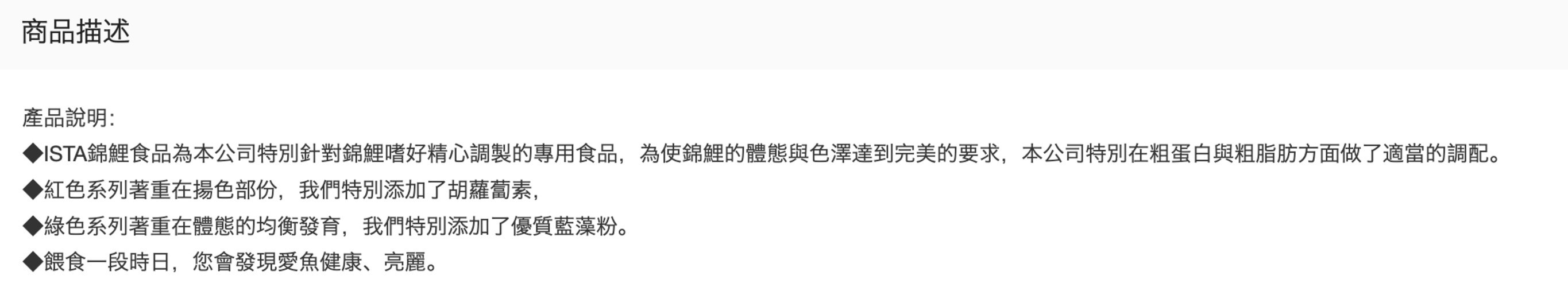- 本產品能迅速增強錦鯉的體色,讓您的愛魚更加鮮豔奪目,觀賞價值倍增。
