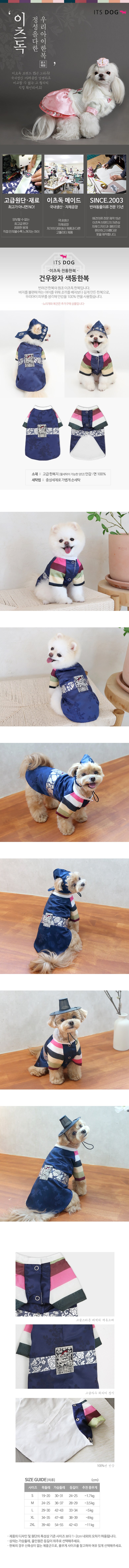 ITS DOG 愛犬韓服,是寵物韓服的鼻祖品牌,擁有 15 年的豐富經驗,堅持韓國自產自銷,品質絕對有保障。為了體貼有些毛孩不喜歡穿褲子,ITS DOG 特別將背心設計得比一般韓服更長,讓毛孩穿著更舒適自在。此款韓服以高雅的寶藍色為底,搭配色彩鮮明的色동,更顯貴氣。精緻的刺繡腰帶,更添質感。 ( 노리개 和 복건 為另外加購商品)