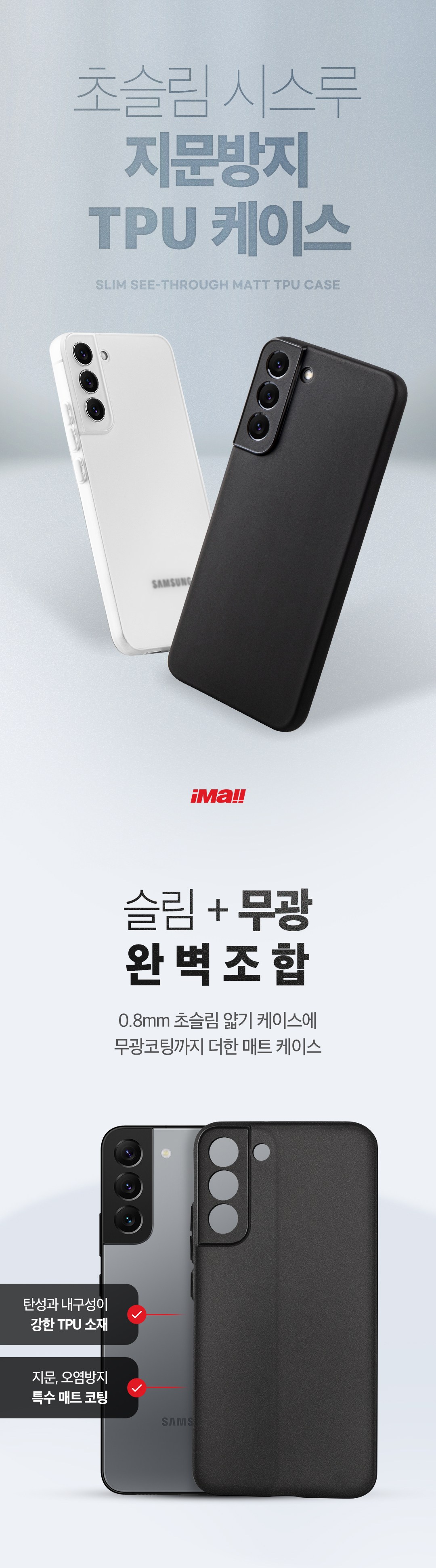 Imall透明超薄防指紋磨砂手機殼,專為Galaxy S24 Ultra設計,採用優質TPU材質,兼具彈性與耐用性。0.8mm超薄設計,提供如同裸機般的握感,輕盈無負擔。霧面塗層處理,有效防指紋、防汙,保持手機殼乾淨美觀。全方位保護設計,包覆相機與按鍵,防止日常刮痕與衝擊,讓您的愛機時刻保持最佳狀態。柔軟TPU材質,拆裝更順暢,不傷手機。