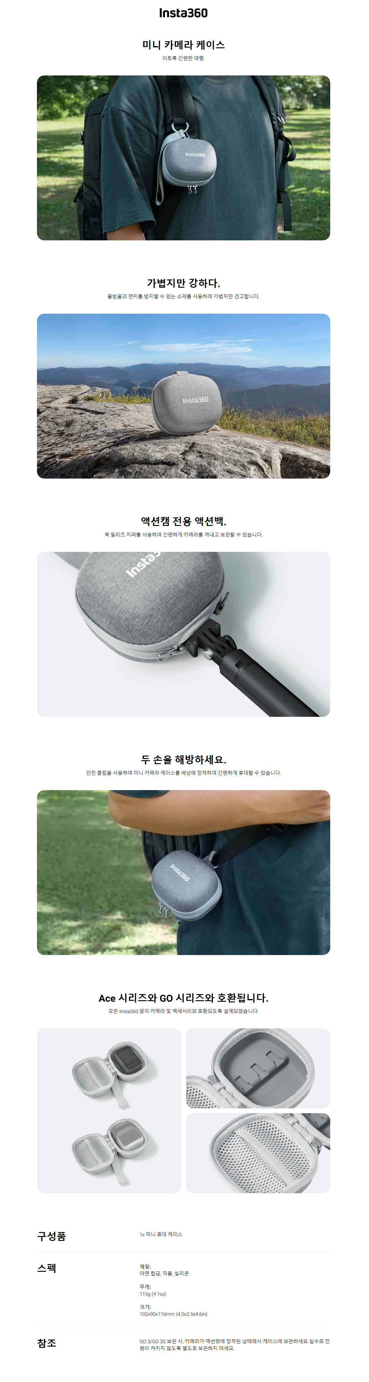 Insta360 迷你相機保護殼專為運動相機設計,輕巧但堅固,採用防潑水防塵材料,讓您輕鬆旅行。快拆拉鍊設計方便快速取出和存放相機。配有安全夾,可將保護殼固定在背包上,解放雙手。此保護殼與 Ace 系列和 GO 系列相容,適用於所有 Insta360 廣角相機及配件。收納 GO 3/GO 3S 時,請將相機安裝在 Action Pod 上的狀態下放入保護殼中,避免意外開機。