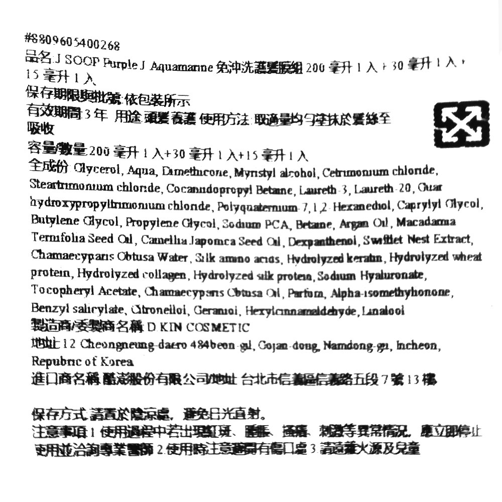 JSOOP Purple J Aquamarine 免沖洗護髮膜組,為您帶來沙龍級的護髮體驗。這款免沖洗護髮膜富含多種蛋白質成分,能深層滋養受損髮絲,讓秀髮恢復健康光澤。其獨特配方能有效鎖住水分,使頭髮柔順易梳理,告別毛躁。使用方法簡單,洗髮後輕輕塗抹於髮尾,無需沖洗,即可享受持久的滋潤效果。套組包含200ml、30ml和15ml三種規格,方便您在家或旅行時隨時呵護秀髮。讓JSOOP Purple J Aquamarine 護髮膜組,成為您打造健康美麗秀髮的秘密武器。