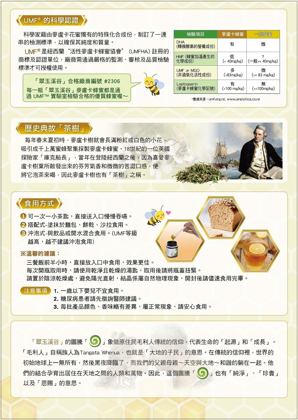 - UMF15+認證確保麥盧卡蜂蜜的獨特活性,讓您在品嚐美味的同時,享受高品質的健康益處。