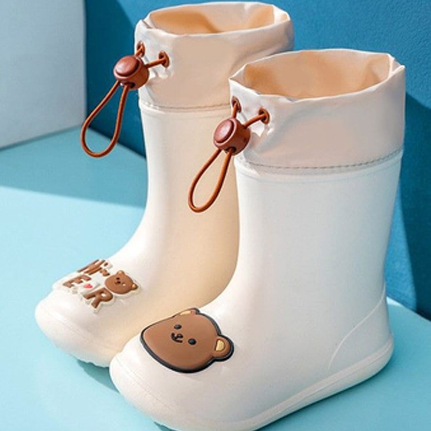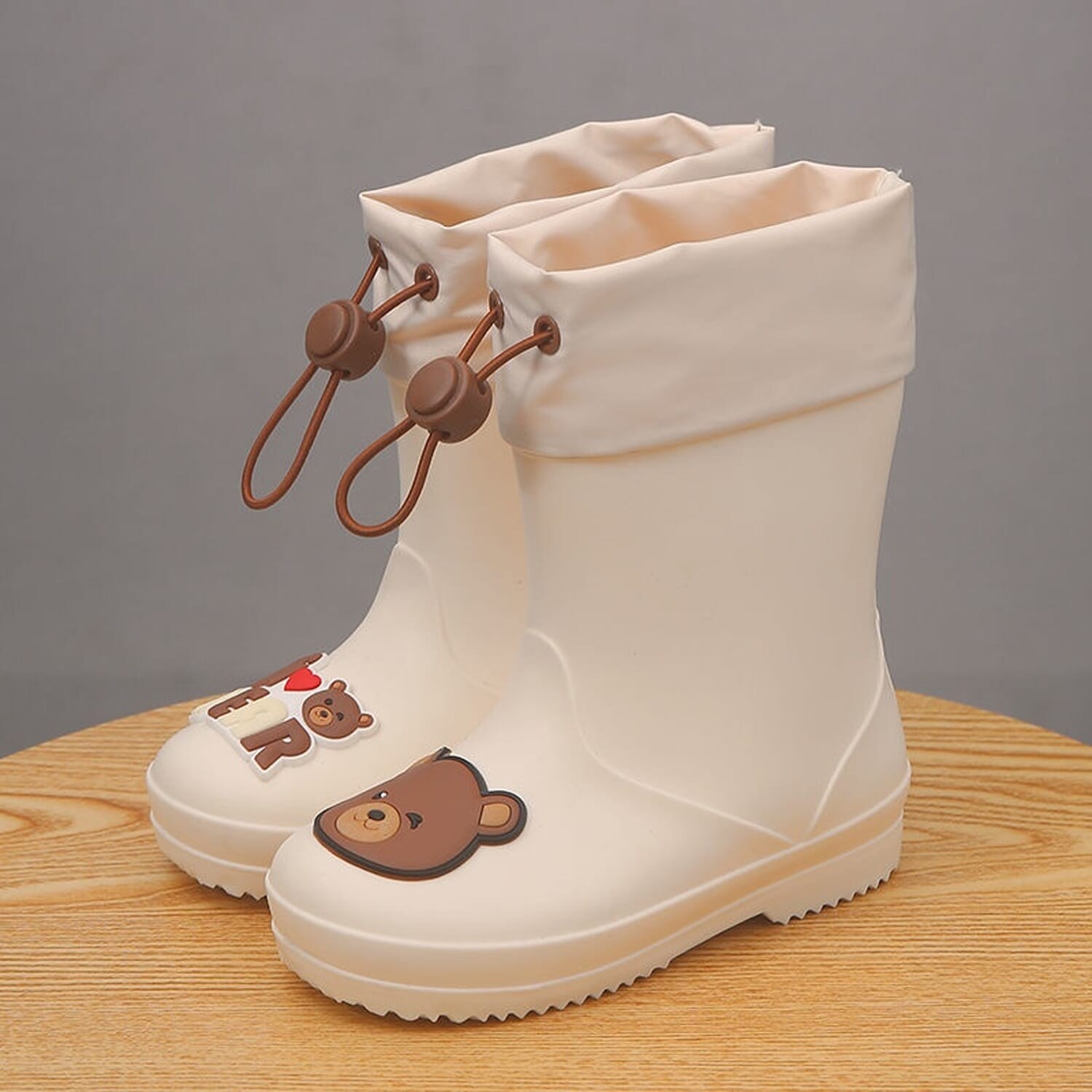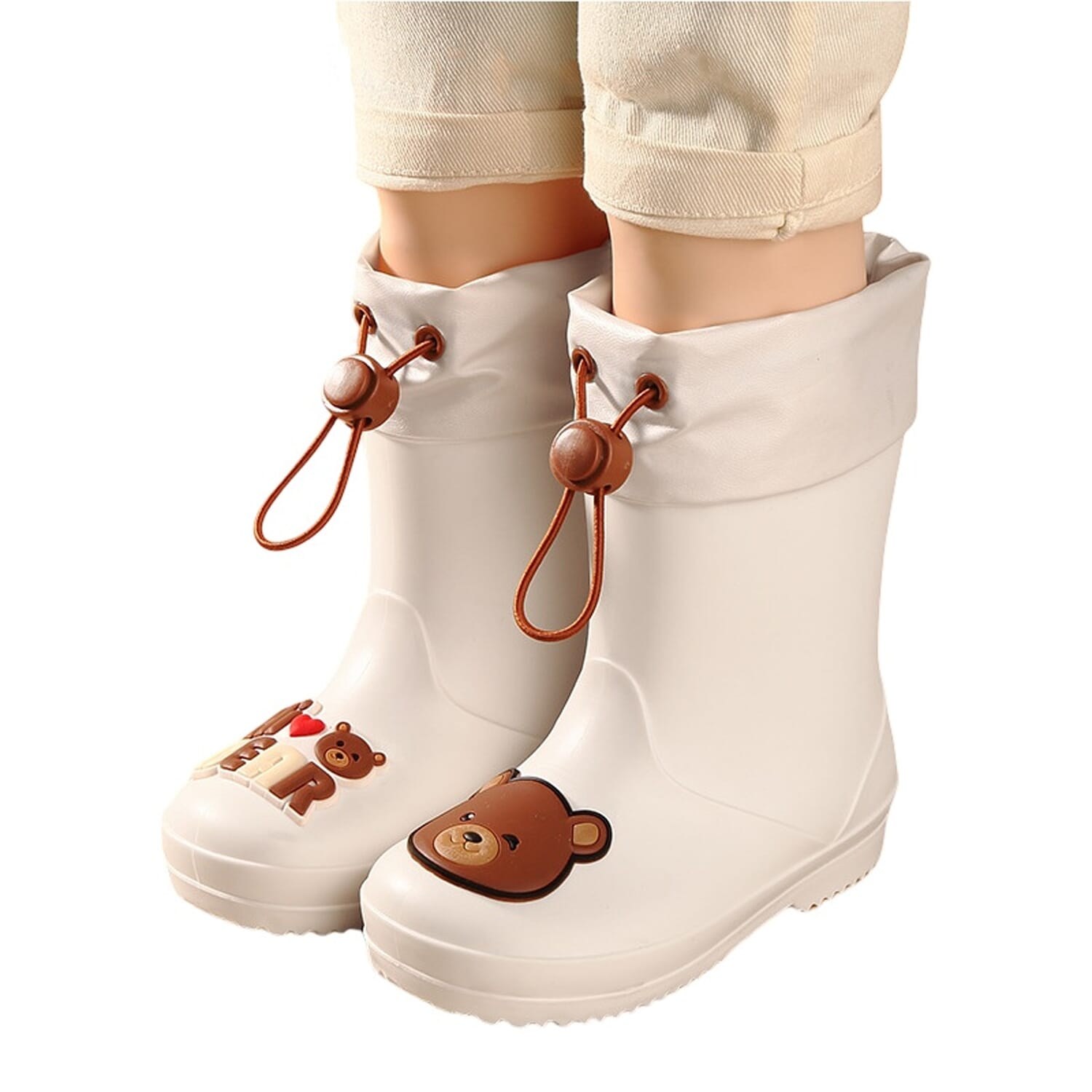 這款萌趣可愛兒童雨鞋,讓您的孩子在雨天也能玩得開心!米白小熊的配色和可愛的卡通造型,讓孩子愛不釋手。採用優質防水材質,有效保護雙腳,搭配易於穿脫的套腳設計,方便孩子自己穿脫。鞋口處有束口設計,保持鞋內乾爽舒適。S碼適合小腳丫,讓孩子在雨天也能安全舒適地玩耍。