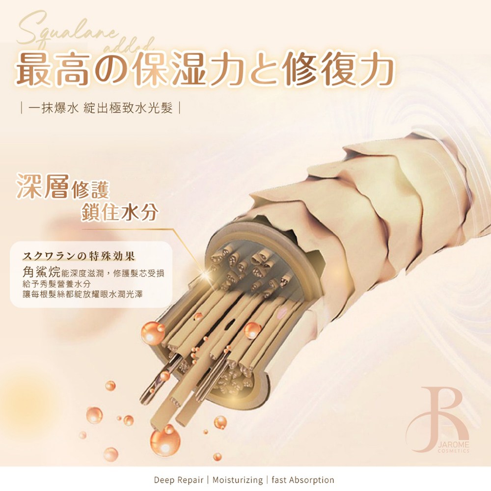 嚴選日本角鯊烷保濕精華,深層滲透髮芯,瞬間補水鎖水,讓乾燥毛躁髮絲秒變柔順亮澤。爆水科技搭配多重修護成分,有效撫平毛鱗片、減少斷裂與打結,一梳到底不卡髮。輕盈不厚重,適合每日使用,洗後髮絲輕盈柔亮,重拾光澤健康髮!