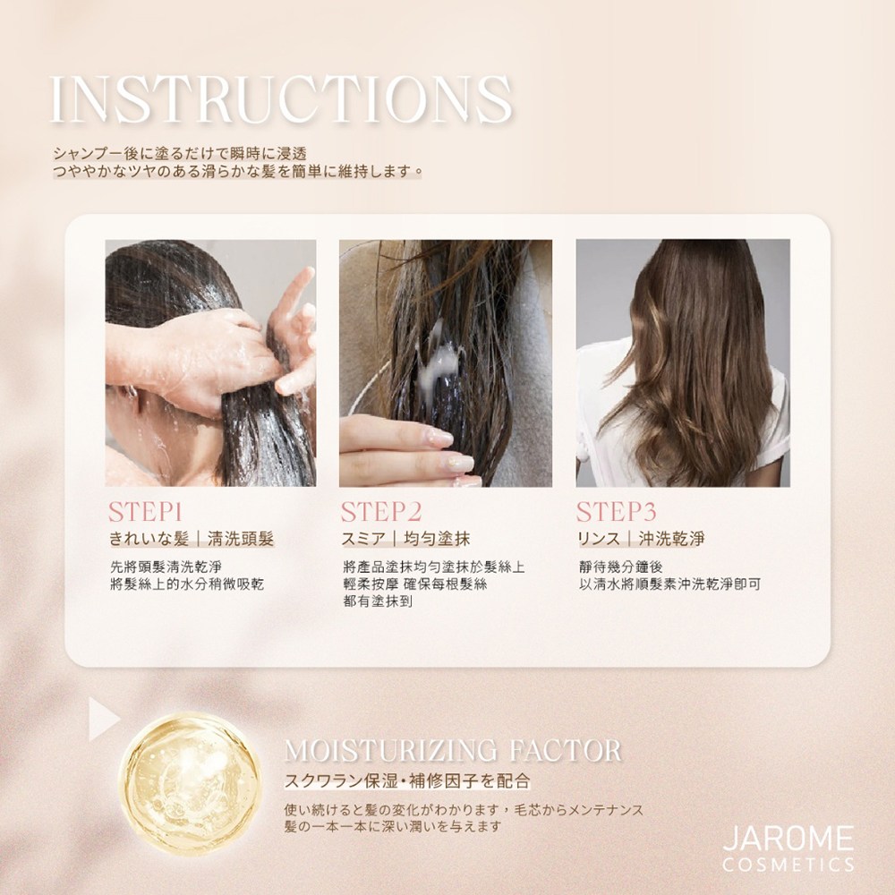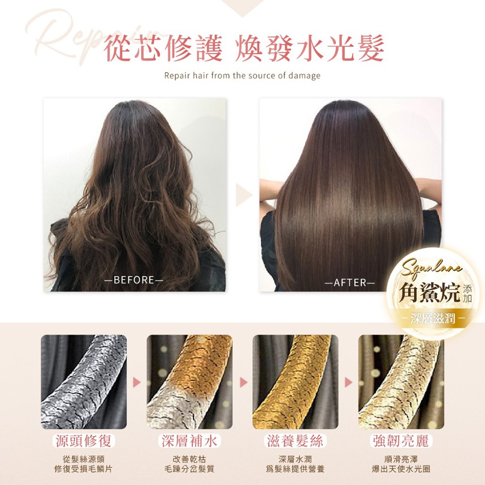 - 高滲透角鯊烷成分直達髮芯,迅速補水鎖水,改善乾枯、毛躁與黯淡無光。