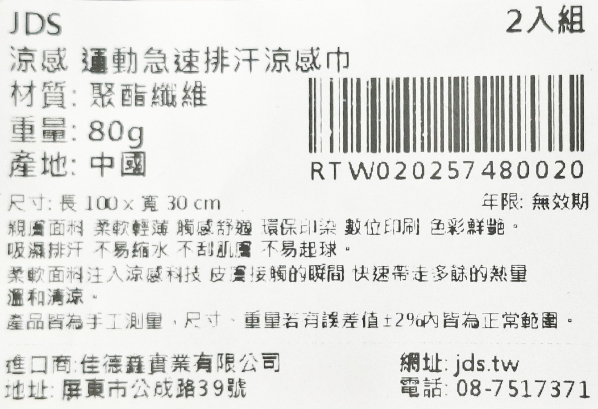 JDS 涼感運動急速排汗涼感巾80g - 運動毛巾/涼感巾, 款式隨機, 2條