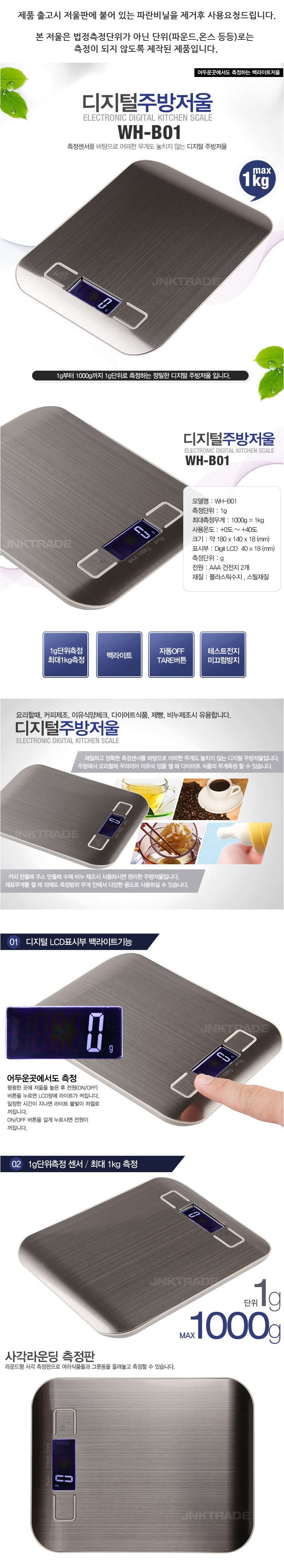 JNK不鏽鋼數位電子秤WH-B01,是您廚房裡不可或缺的好幫手。這款電子秤採用高精度感應器,能精確測量1g到1kg的重量,滿足您多樣化的烹飪需求。具備背光LCD顯示螢幕,即使在昏暗的環境下也能清晰讀取測量數據。此外,它還具備去皮功能,讓您輕鬆扣除容器重量,直接測量食材淨重。無論是烘焙、製作咖啡或準備嬰兒食品,這款電子秤都能助您一臂之力,讓您的烹飪過程更加精準、便捷。