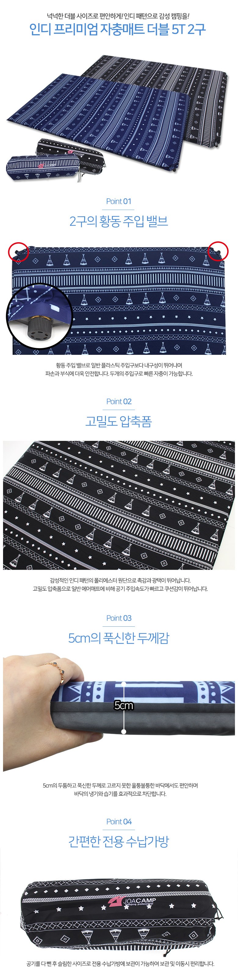 JOACAMP 高級印花床墊採用雙人加大尺寸設計,讓您在露營時也能享受寬敞舒適的睡眠體驗。其高密度壓縮泡棉不僅充氣速度快,更提供卓越的緩衝性能,有效隔絕地面濕氣與寒冷。獨特的印地安圖案設計,為您的露營增添感性氛圍。配備兩個黃銅充氣閥,堅固耐用且充氣快速。專用收納袋讓收納與攜帶更加方便,是您戶外露營的理想選擇。