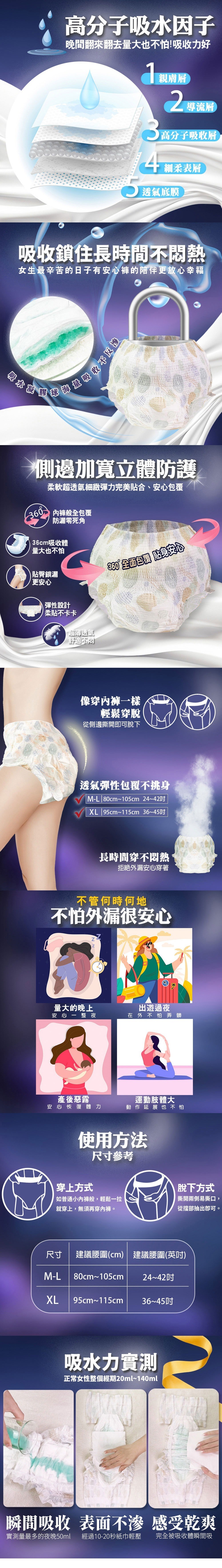 衛生棉褲成人褲單片裝,M-L 尺寸,一組 20 片裝,為女性提供安心舒適的生理期呵護。採用高分子吸收體,能迅速吸收並鎖住水分,保持乾爽透氣,避免悶熱不適。內褲型設計,穿脫方便,如同一般內褲般輕鬆自在,側邊易撕設計更方便更換。360 度全面包覆,讓您在量大夜晚、外出旅行、產後惡露或運動時都能安心無憂。M-L 尺寸適合腰圍 80cm 至 105cm 的使用者,讓您隨時隨地都能享受乾爽舒適的體驗。