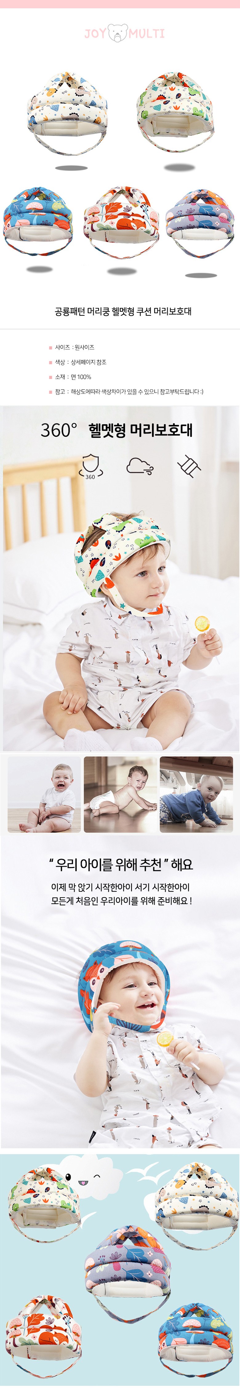 JOYMULTI幼兒款恐龍圖案頭部撞擊頭盔型緩衝保護墊,專為學坐、學站的寶寶設計。採用輕盈材質,重量小於一根香蕉,寶寶配戴無負擔。360°頭盔型設計,提供全方位保護,柔軟緩衝墊有效分散撞擊力道。透氣性佳,即使多汗寶寶也能保持乾爽舒適。魔鬼氈設計,尺寸可調節,方便調整至最適合寶寶頭部的大小。