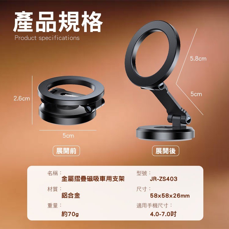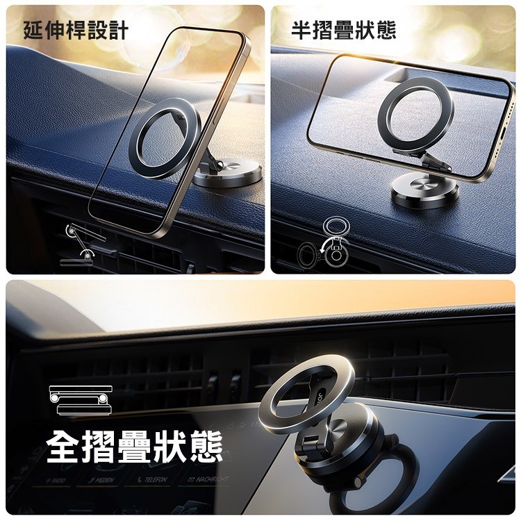 JOYROOM 金屬摺疊磁吸車用支架,為您的駕駛體驗帶來前所未有的便捷與安全。這款支架採用全鋁合金材質,不僅美觀耐用,更能完美融入各種車款內裝。其獨特的N52磁鐵超強磁力設計,能牢牢吸住4~7吋的智慧型手機,讓您在行車過程中無需擔心手機掉落。270度可調雙鉸鏈設計,不僅可摺疊節省空間,更能根據您的需求調整最佳視角。此外,升級的3M奈米膠粘貼技術,確保支架牢固不晃動,讓您在享受便捷駕駛的同時,也能擁有更安全的行車體驗。360度可旋轉底座,讓您隨時調整手機方向,無論導航、通話或音樂播放,都能輕鬆應對。
