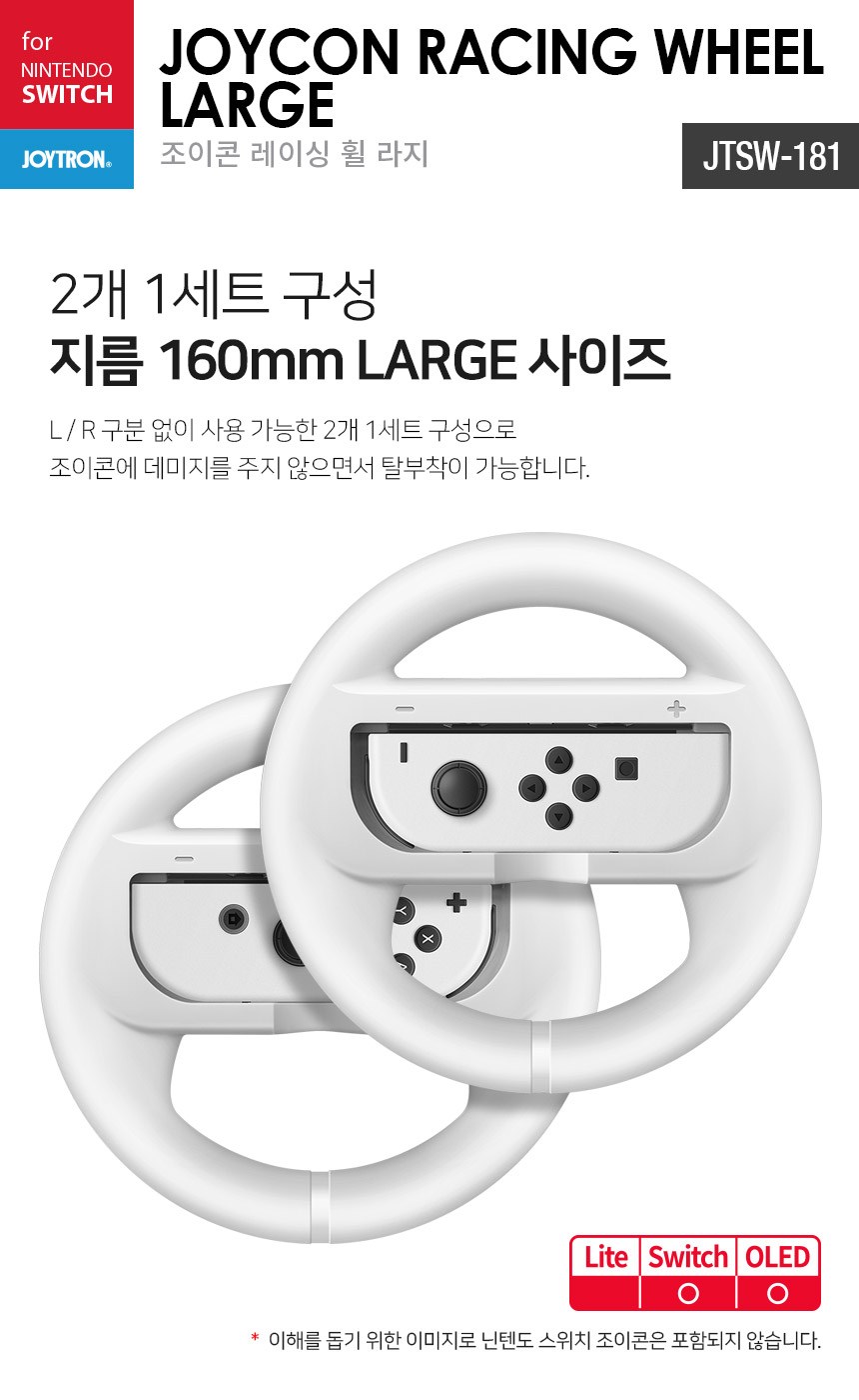 JOYTRON Joy-Con 賽車方向盤大號,專為 Nintendo Switch Joy-Con 設計,提供更真實的賽車遊戲體驗。加大尺寸設計,讓手大的玩家也能舒適握持,告別不便。順暢的SL/SR扳機按鈕,提升遊戲沉浸感。輕量化材質,長時間遊玩也不感疲勞。簡單安裝,不損壞Joy-Con,立即享受刺激的賽車樂趣。