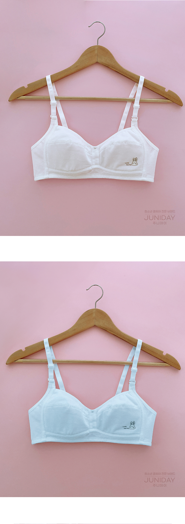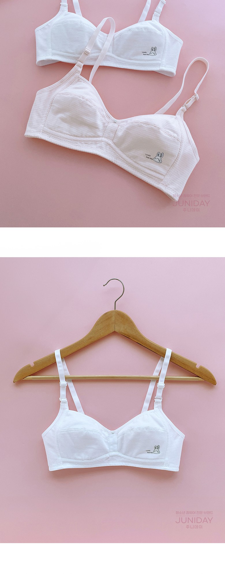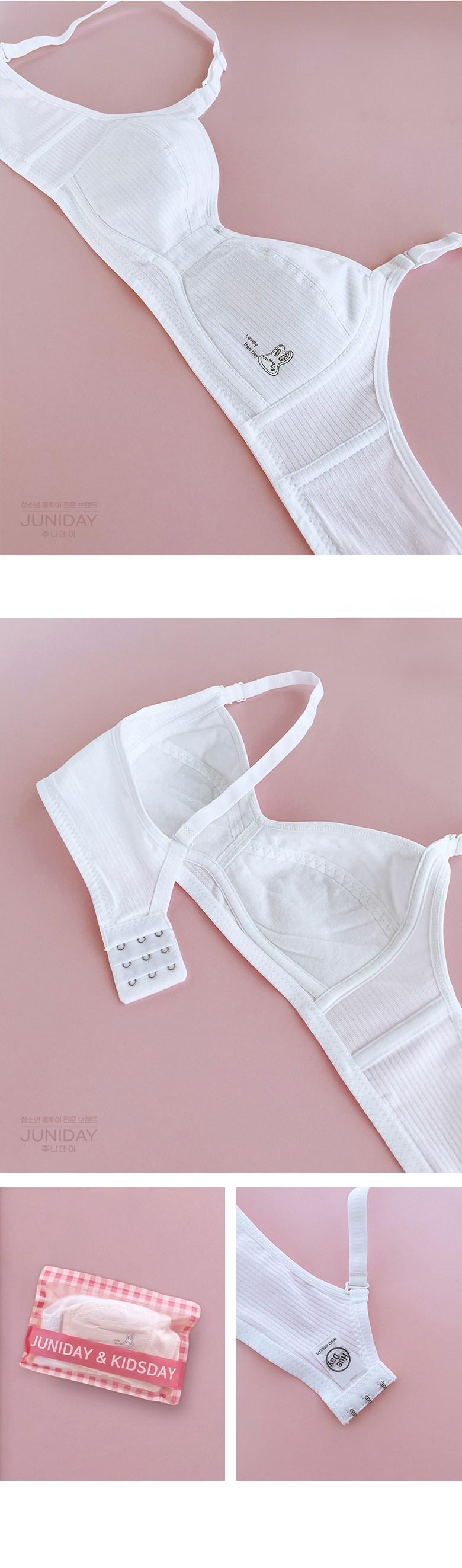 JUNIDAY可愛兔子成長內衣2入套裝,專為青少年設計,採用柔軟舒適的羅紋布料,搭配可愛的兔子造型點綴,增添青春活力。無鋼圈設計,提供無壓迫感的舒適穿著體驗,讓女孩們在成長階段也能自在活動。此款內衣吸濕排汗,透氣性佳,適合日常穿著。套裝包含兩種顏色,白色+藍色,方便替換。材質為棉95%與聚酯纖維5%混紡,建議手洗並避免烘乾,以延長產品壽命。
