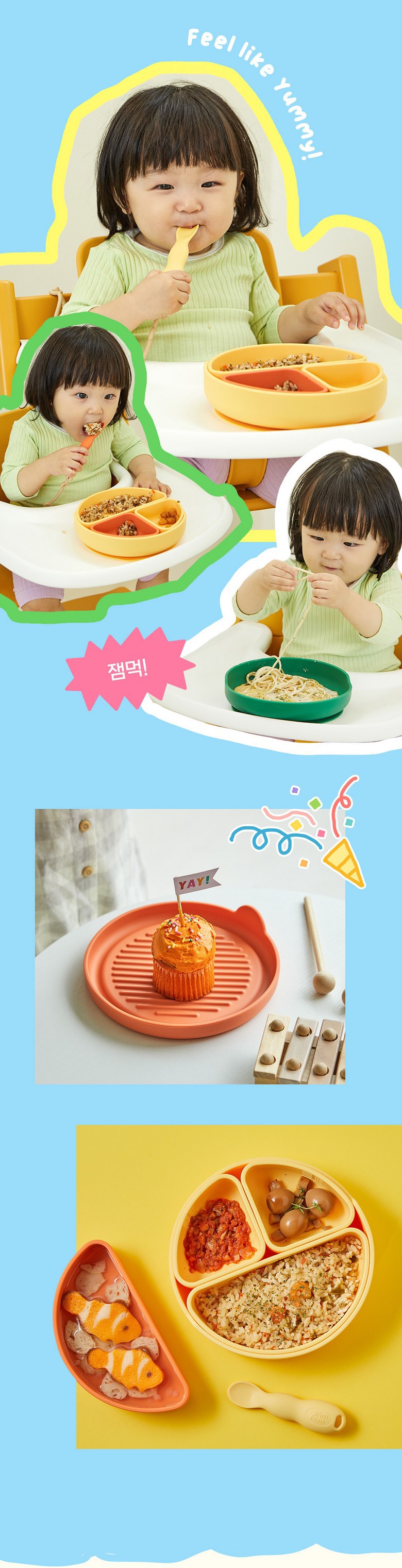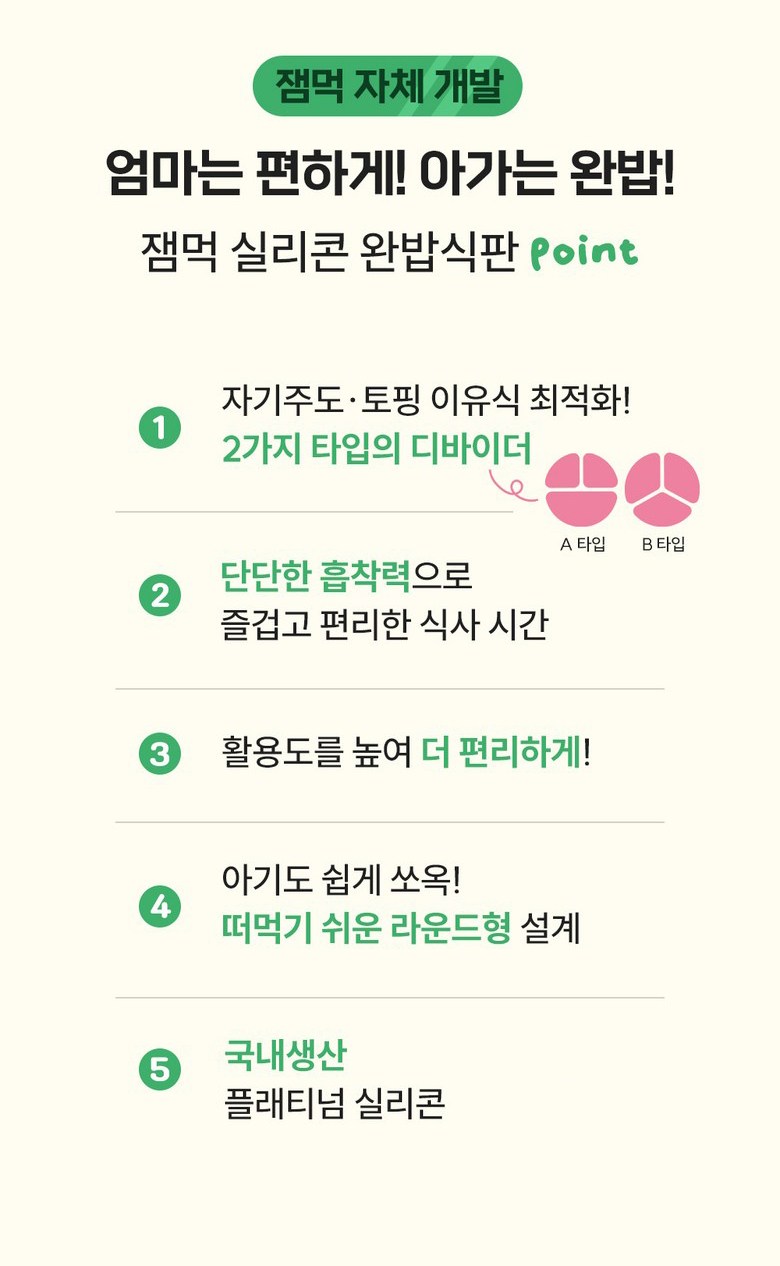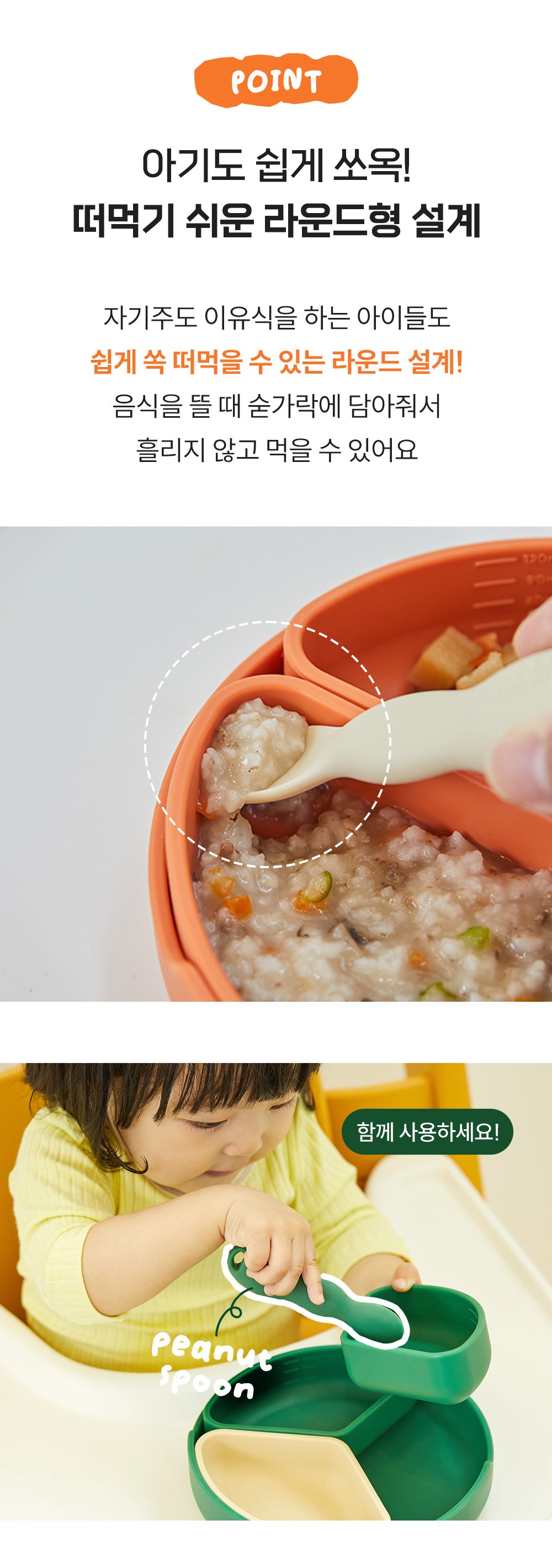 - 圓形矽膠餐盤搭配吸盤設計,讓寶寶用餐時不易打翻,保持桌面清潔。