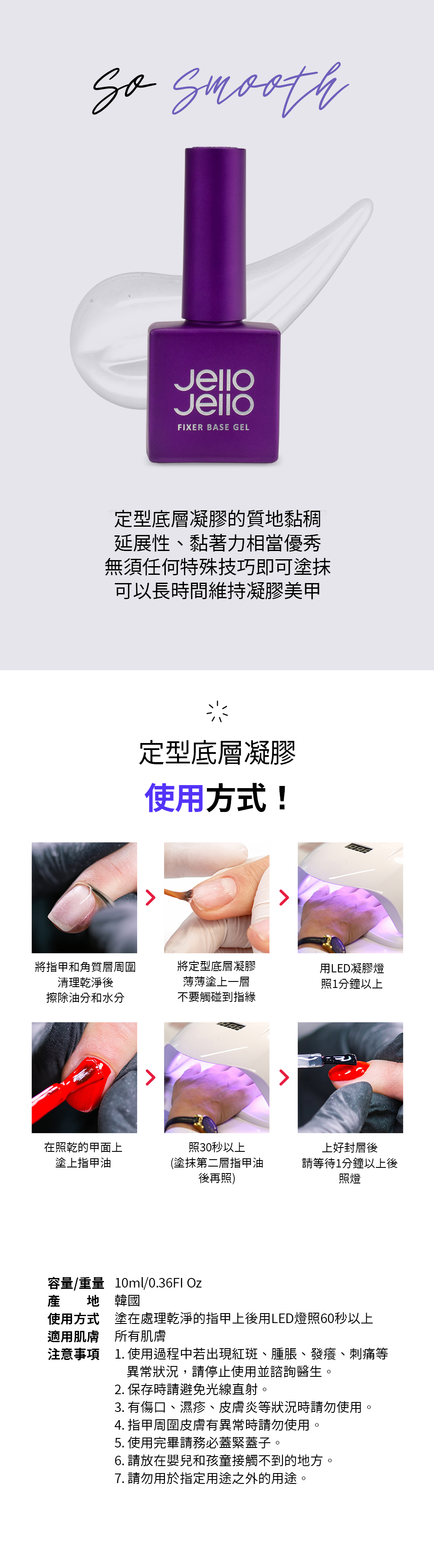 Jello Jello 定型底層凝膠是您打造完美持久美甲的秘密武器。這款底層凝膠能有效增強指甲油的附著力,讓您的美甲不易剝落,色彩更持久亮麗。其獨特配方能快速固化,節省您的寶貴時間,讓您在家也能輕鬆享受專業級的美甲體驗。使用 Jello Jello 定型底層凝膠,讓您的指尖綻放迷人光彩,展現您的個人風格。無論是日常妝扮還是特殊場合,都能讓您的指甲成為眾人矚目的焦點。