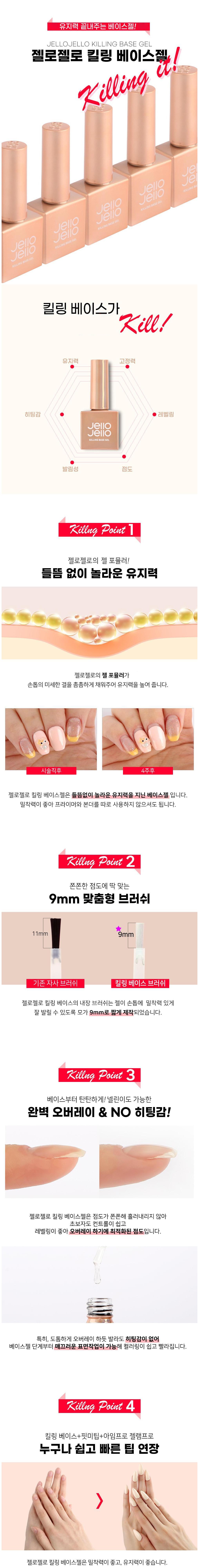 Jello Jello Killing 指甲油套組包含底膠和頂膠,為您打造持久亮麗的美甲。底膠能緊密貼合甲面,增加凝膠的附著力,防止指甲剝落。頂膠具有高光澤和耐磨性,能保護指甲免受刮損,讓您的美甲持久如新。此套組操作簡單,即使是美甲新手也能輕鬆上手,享受專業級的美甲體驗。讓您的指尖綻放光彩,展現個人魅力。