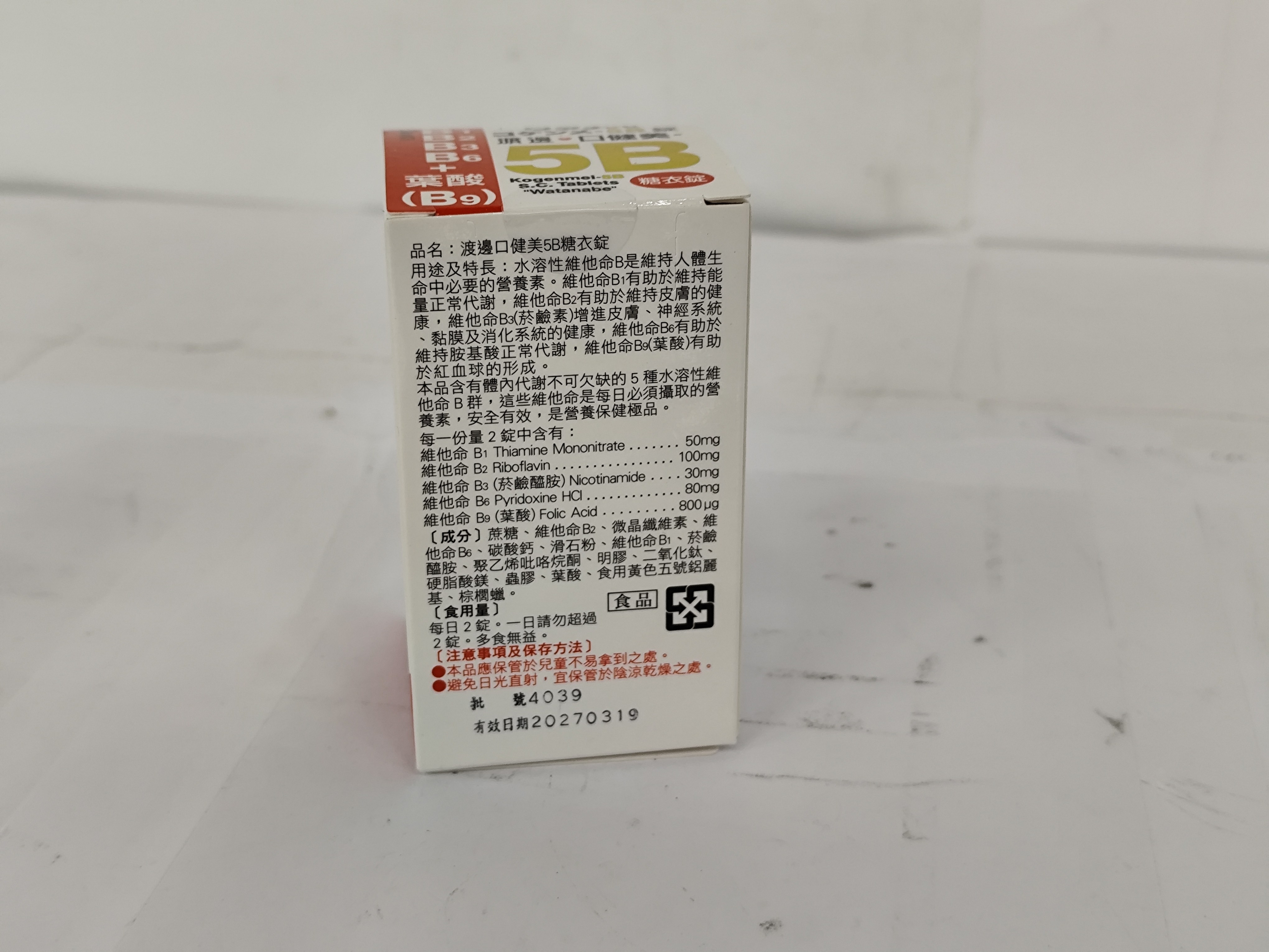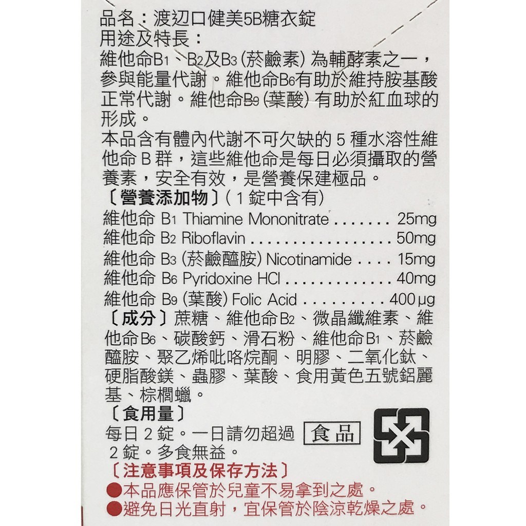 渡邊口健美5B糖衣錠,為您的健康注入活力!這款綜合維生素B群,每罐含有120顆糖衣錠,方便每日補充。維生素B群是維持能量代謝、增進皮膚和神經系統健康的重要營養素。本產品採用高品質成分,安全有效,讓您輕鬆擁有健康好氣色。每日服用,為您的身體提供全方位的營養支持,讓您充滿活力每一天。