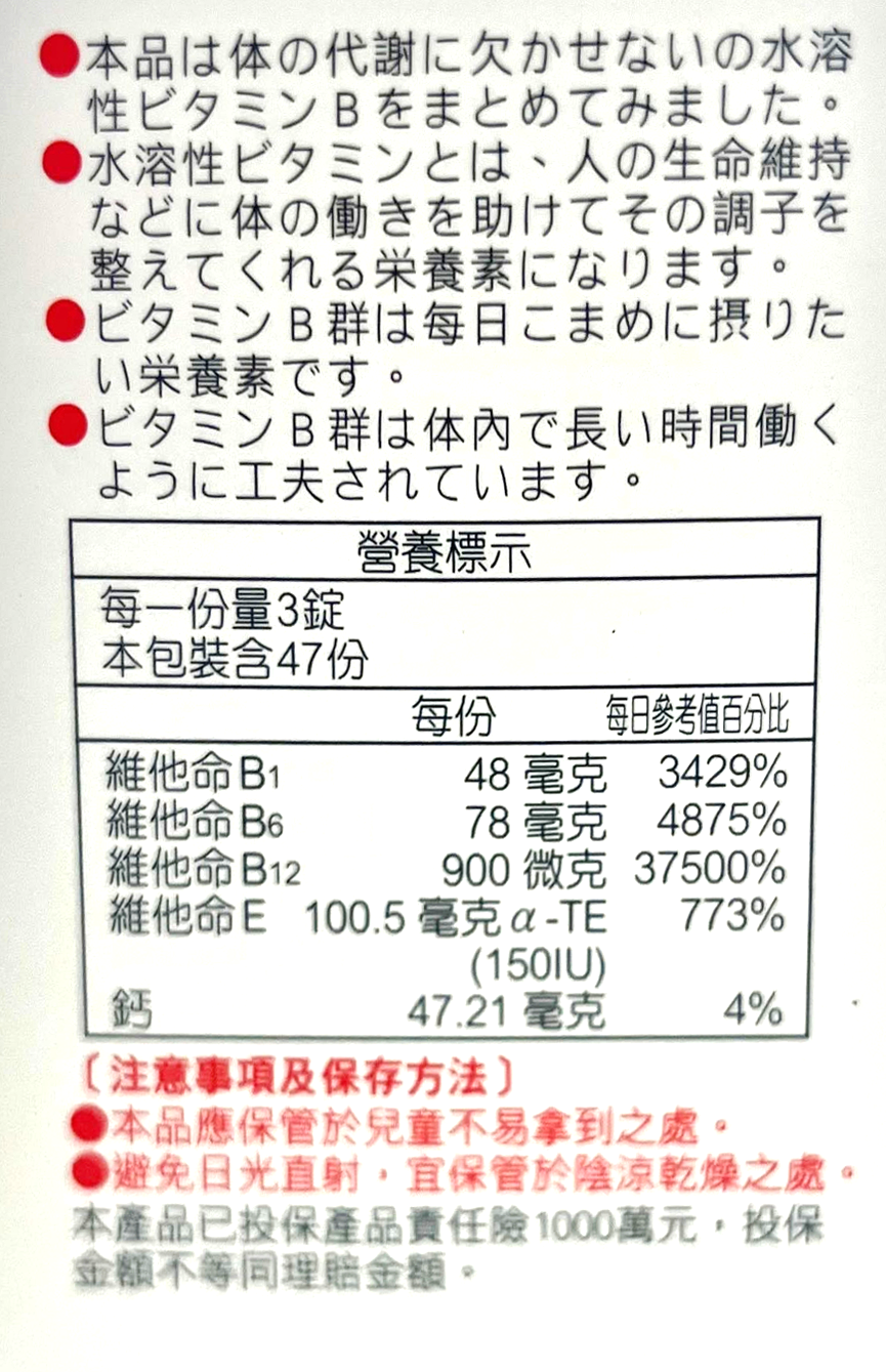- 內含維生素B1、B6、B12,協同作用,調整體質,增強體力,維持生理機能。