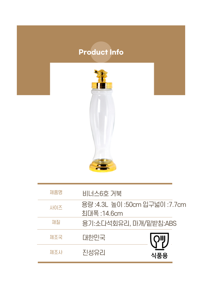 眞誠玻璃維納斯6號龜釀酒瓶,採用韓國製造的優質鈉鈣玻璃,堅固耐用且安全無虞。其獨特的烏龜造型,不僅是長壽的象徵,更為您的居家生活增添一份藝術氣息。4.3公升的容量適合釀造各式酒類或醃漬食品,讓您輕鬆享受DIY的樂趣。瓶蓋設計方便傾倒,底座穩固不易傾倒。使用溫水或酒精消毒清潔,即可重複使用,是您釀酒或收納食物的最佳選擇。