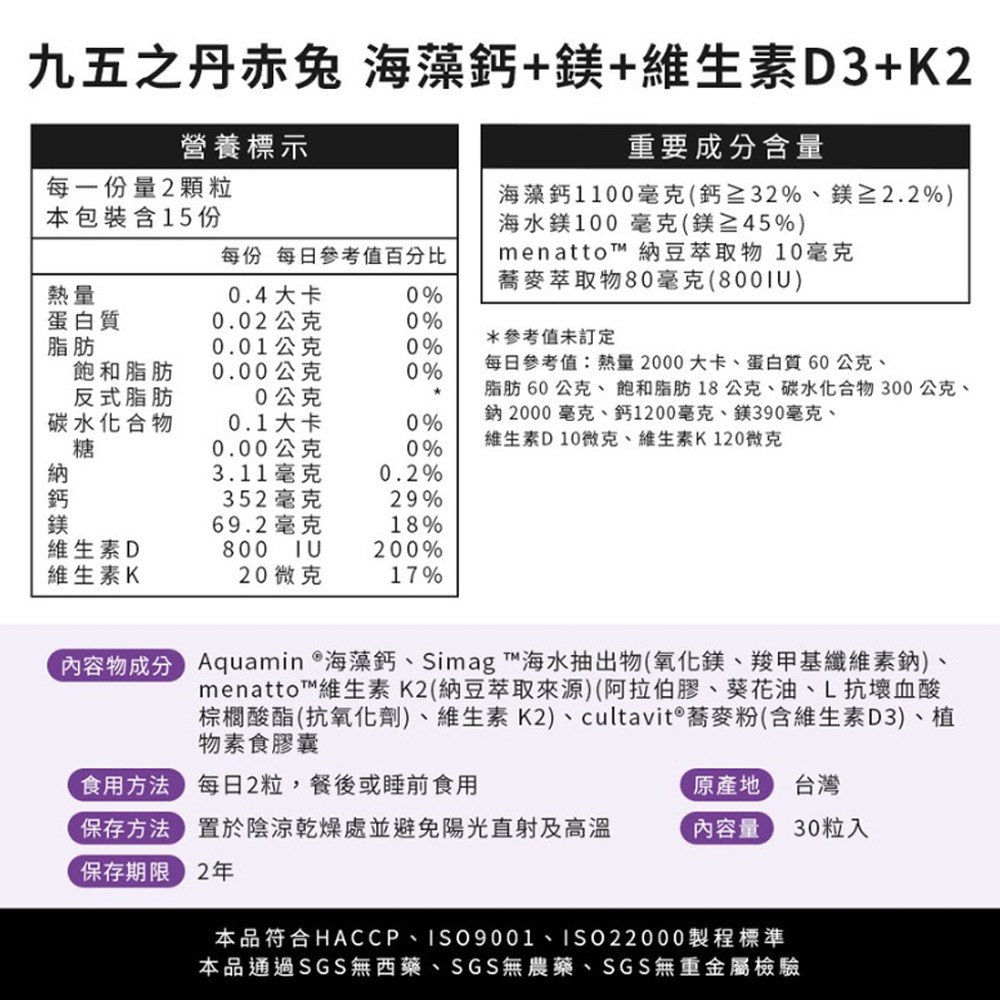 赤兔海藻鈣+鎂維生素D3+K2,是一款結合多種關鍵營養素的保健品,旨在強健體魄、提升保護力。本產品採用愛爾蘭海藻鈣Aquamin,每份提供1100毫克鈣質,有助於維持骨骼健康。同時,添加法國海水鎂Simag,促進鈣質吸收,維持生理機能。每包含有30粒膠囊,方便每日補充,是您維持健康活力的理想選擇。本產品更榮獲世界品質評鑑大賞肯定,品質值得信賴。