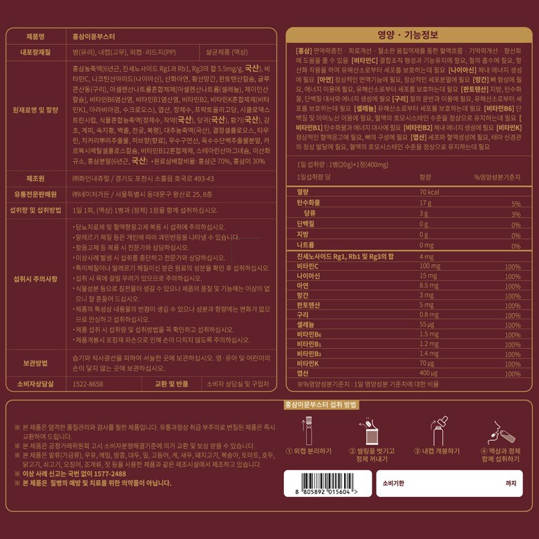 - 內含紅蔘精華及多種傳統草本配方,有助於增強體力,促進新陳代謝,提升保護力。