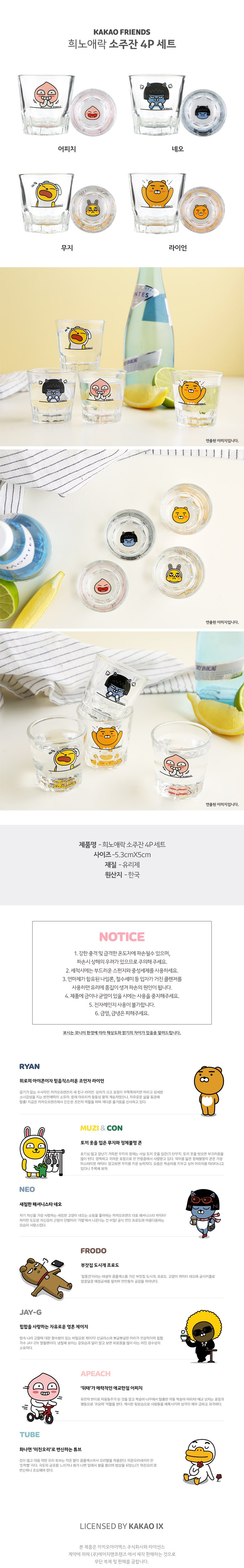 KAKAO FRIENDS 喜怒哀樂燒酒杯,一套四入,將可愛的KAKAO FRIENDS角色融入您的生活。每個杯子都印有不同的角色表情,增添飲酒的樂趣。採用透明玻璃材質,讓您在品嚐燒酒的同時,也能欣賞飲品的色澤。無論是朋友聚會還是獨自小酌,這款燒酒杯都能為您帶來歡樂的氛圍。請注意,使用時避免劇烈溫差,並使用柔軟海綿清洗,以延長產品使用壽命。