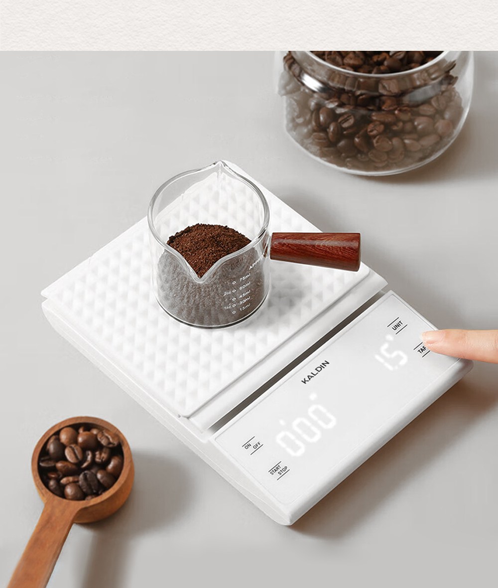 KALDIN手沖咖啡專用電子秤,是您享受精準手沖咖啡的理想選擇。這款電子秤不僅提供精確的重量測量,還具備計時功能,幫助您掌握最佳的萃取時間。簡潔的LED顯示屏和直觀的按鈕設計,操作簡單方便。隨附的防滑墊,確保測量過程中的穩定性。緊湊的設計和時尚的外觀,完美融入您的咖啡角落,提升您的手沖咖啡體驗。