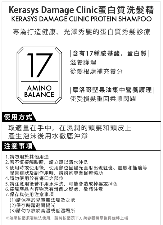 - 專為染燙受損髮設計,胺基酸賦活配方能深層修護,恢復秀髮健康光澤。