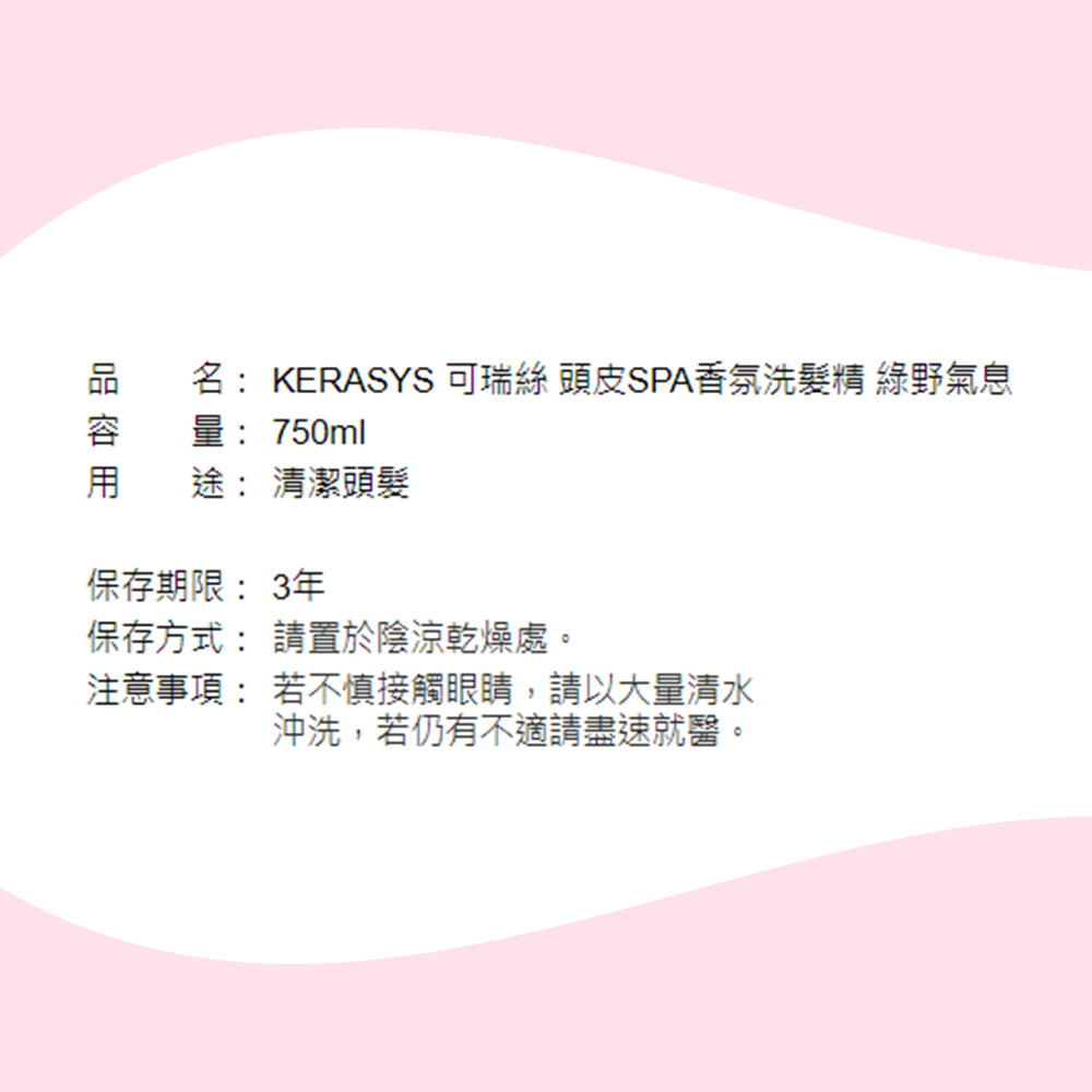 KERASYS 頭皮SPA香氛洗髮精-綠野氣息,為您帶來750ml的頭皮清潔新體驗。這款洗髮精專為呵護頭皮健康而設計,能溫和去除頭皮老廢角質及多餘油脂,讓頭皮深呼吸,髮根更健康。綠野氣息香氛,彷彿置身於寧靜的大自然中,舒緩壓力,帶來愉悅的洗髮體驗。無添加矽靈等五種疑慮成分,溫和低刺激,敏感性頭皮也能安心使用。使用後,頭皮清爽舒適,秀髮柔順亮麗,散發健康光澤。