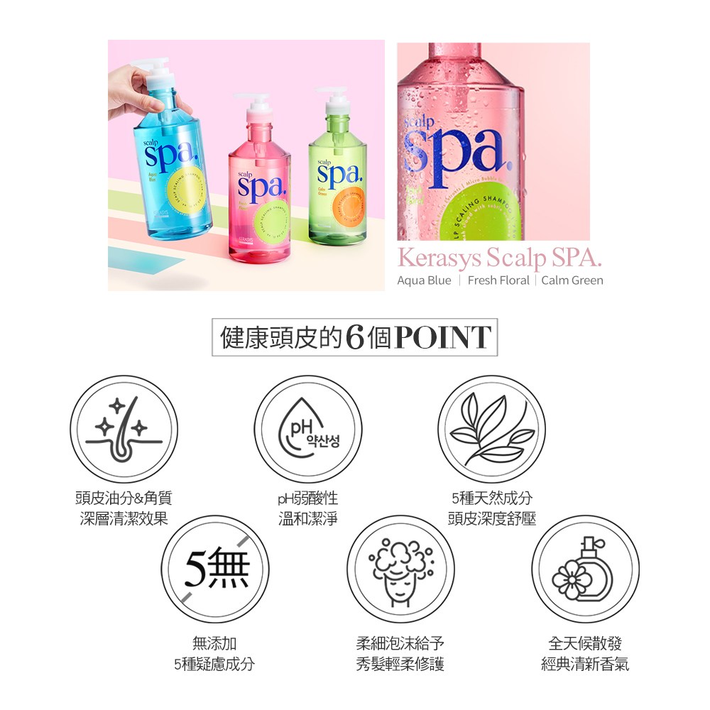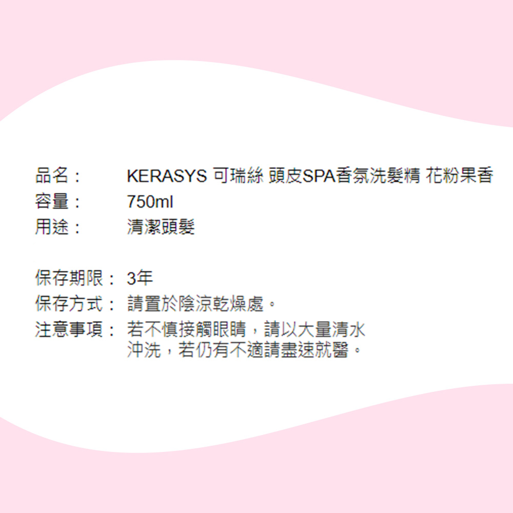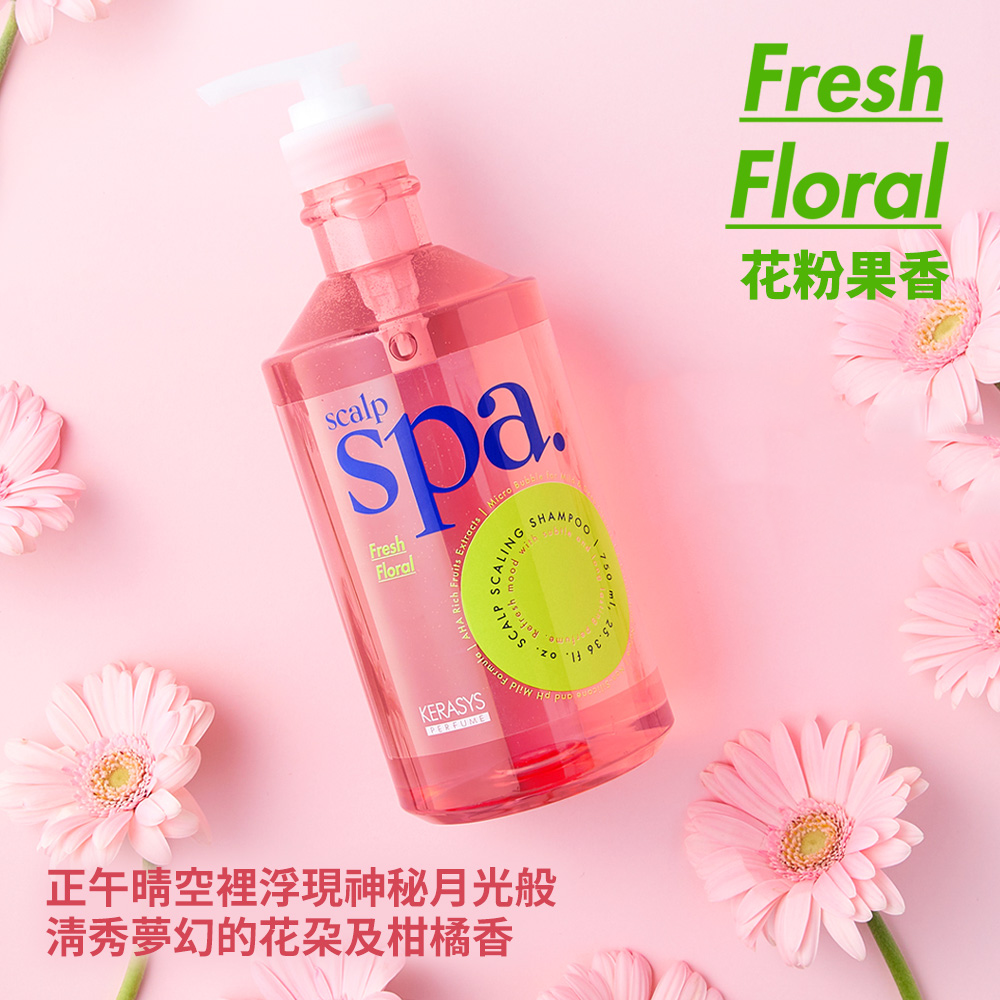 KERASYS 頭皮SPA香氛洗髮精,花粉果香,為您帶來清新舒爽的頭皮護理體驗,能溫和清潔頭皮,去除老廢角質,讓頭皮深呼吸。獨特的花粉果香,讓您在洗髮的同時,享受愉悅的香氛SPA。無添加Paraben、矽靈等五種疑慮成分,溫和低刺激,通過皮膚刺激測試,敏感性頭皮也能安心使用。750ml大容量,讓您享受更持久的頭皮SPA護理。