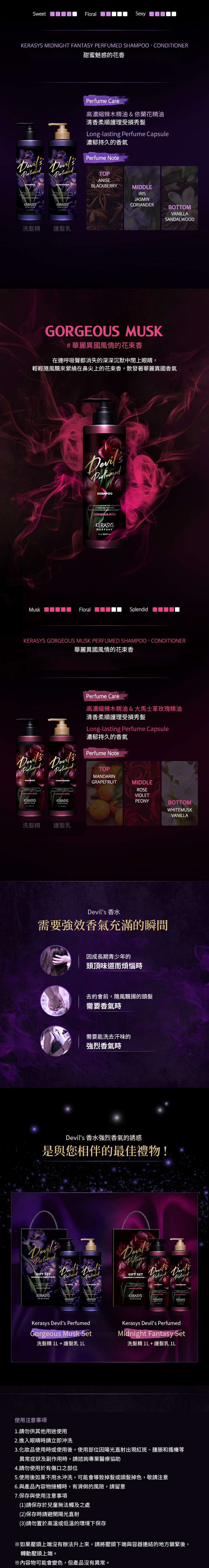 Kerasys 可瑞絲 Devil's Perfumed 洗髮乳+潤髮乳套組,為您的秀髮帶來奢華的香氛體驗。這款混合套組專為所有髮質設計,特別適合一般頭皮。每瓶容量1000ml,讓您長時間享受其獨特的麝香/粉香。洗髮乳溫和清潔頭皮與髮絲,潤髮乳則深層滋潤,使秀髮柔順亮麗。其獨特香氛能持久散發迷人魅力,讓您在舉手投足間都充滿自信。無論是自用或送禮,這款Kerasys香氛護理套組都是絕佳選擇。