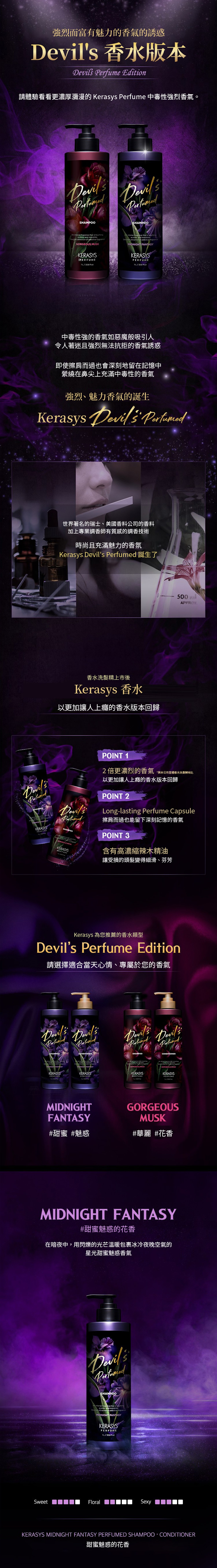 - 體驗KERASYS香氛洗髮乳,讓髮絲散發持久迷人香氣,彷彿噴上精緻香水般動人。
